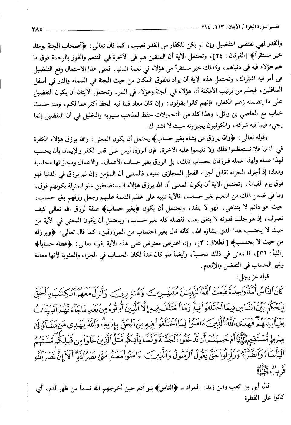 كانَ النَّاسُ أُمَّةً واحِدَةً فَبَعَثَ اللَّهُ النَّبِيِّينَ مُبَشِّرِينَ وَمُنْذِرِينَ وَأَنْزَلَ مَعَهُمُ الْكِتابَ بِالْحَقِّ لِيَحْكُمَ بَيْنَ النَّاسِ فِيمَا اخْتَلَفُوا فِيهِ وَمَا اخْتَلَفَ فِيهِ إِلاَّ الَّذِينَ أُوتُوهُ مِنْ بَعْدِ ما جاءَتْهُمُ الْبَيِّناتُ بَغْياً بَيْنَهُمْ فَهَدَى اللَّهُ الَّذِينَ آمَنُوا لِمَا اخْتَلَفُوا فِيهِ مِنَ الْحَقِّ بِإِذْنِهِ وَاللَّهُ يَهْدِي مَنْ يَشاءُ إِلى صِراطٍ مُسْتَقِيمٍ (٢١٣) أَمْ حَسِبْتُمْ أَنْ تَدْخُلُوا الْجَنَّةَ وَلَمَّا يَأْتِكُمْ مَثَلُ الَّذِينَ خَلَوْا مِنْ قَبْلِكُمْ مَسَّتْهُمُ الْبَأْساءُ وَالضَّرَّاءُ وَزُلْزِلُوا حَتَّى يَقُولَ الرَّسُولُ وَالَّذِينَ آمَنُوا مَعَهُ مَتى نَصْرُ اللَّهِ أَلا إِنَّ نَصْرَ اللَّهِ قَرِيبٌ (٢١٤)