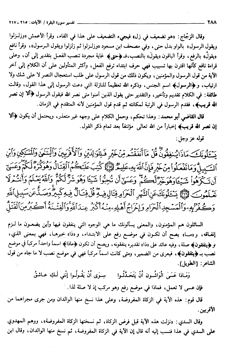 يَسْئَلُونَكَ ماذا يُنْفِقُونَ قُلْ ما أَنْفَقْتُمْ مِنْ خَيْرٍ فَلِلْوالِدَيْنِ وَالْأَقْرَبِينَ وَالْيَتامى وَالْمَساكِينِ وَابْنِ السَّبِيلِ وَما تَفْعَلُوا مِنْ خَيْرٍ فَإِنَّ اللَّهَ بِهِ عَلِيمٌ (٢١٥) كُتِبَ عَلَيْكُمُ الْقِتالُ وَهُوَ كُرْهٌ لَكُمْ وَعَسى أَنْ تَكْرَهُوا شَيْئاً وَهُوَ خَيْرٌ لَكُمْ وَعَسى أَنْ تُحِبُّوا شَيْئاً وَهُوَ شَرٌّ لَكُمْ وَاللَّهُ يَعْلَمُ وَأَنْتُمْ لا تَعْلَمُونَ (٢١٦) يَسْئَلُونَكَ عَنِ الشَّهْرِ الْحَرامِ قِتالٍ فِيهِ قُلْ قِتالٌ فِيهِ كَبِيرٌ وَصَدٌّ عَنْ سَبِيلِ اللَّهِ وَكُفْرٌ بِهِ وَالْمَسْجِدِ الْحَرامِ وَإِخْراجُ أَهْلِهِ مِنْهُ أَكْبَرُ عِنْدَ اللَّهِ وَالْفِتْنَةُ أَكْبَرُ مِنَ الْقَتْلِ وَلا يَزالُونَ يُقاتِلُونَكُمْ حَتَّى يَرُدُّوكُمْ عَنْ دِينِكُمْ إِنِ اسْتَطاعُوا وَمَنْ يَرْتَدِدْ مِنْكُمْ عَنْ دِينِهِ فَيَمُتْ وَهُوَ كافِرٌ فَأُولئِكَ حَبِطَتْ أَعْمالُهُمْ فِي الدُّنْيا وَالْآخِرَةِ وَأُولئِكَ أَصْحابُ النَّارِ هُمْ فِيها خالِدُونَ (٢١٧)