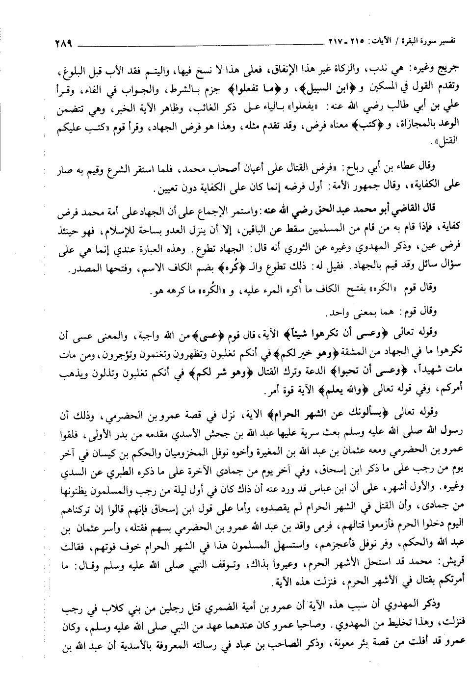 وقوله تعالى يَسْئَلُونَكَ عَنِ الشَّهْرِ الْحَرامِ الآية، نزل في قصة عمرو بن الحضرمي، وذلك أن رسول الله صلى الله عليه وسلم بعث سرية عليها عبد الله بن جحش الأسدي مقدمه من بدر الأولى، فلقوا عمرو بن الحضرمي ومعه عثمان بن عبد الله بن المغيرة وأخوه نوفل المخزوميان والحكم بن كيسان في آخر يوم من رجب على ما ذكر ابن إسحاق، وفي آخر يوم من جمادى الآخرة على ما ذكره الطبري عن السدي وغيره. والأول أشهر، على أن ابن عباس قد ورد عنه أن ذاك كان في أول ليلة من رجب والمسلمون يظنونها من جمادى، وأن القتل في الشهر الحرام لم يقصدوه، وأما على قول ابن إسحاق فإنهم قالوا إن تركناهم اليوم دخلوا الحرم فأزمعوا قتالهم، فرمى واقد بن عبد الله عمرو بن الحضرمي بسهم فقتله، وأسر عثمان بن عبد الله والحكم، وفر نوفل فأعجزهم، واستسهل المسلمون هذا في الشهر الحرام خوف فوتهم، فقالت قريش: محمد قد استحل الأشهر الحرم، وعيروا بذلك، وتوقف النبي صلى الله عليه وسلم وقال: ما أمرتكم بقتال في الأشهر الحرم، فنزلت هذه الآية.