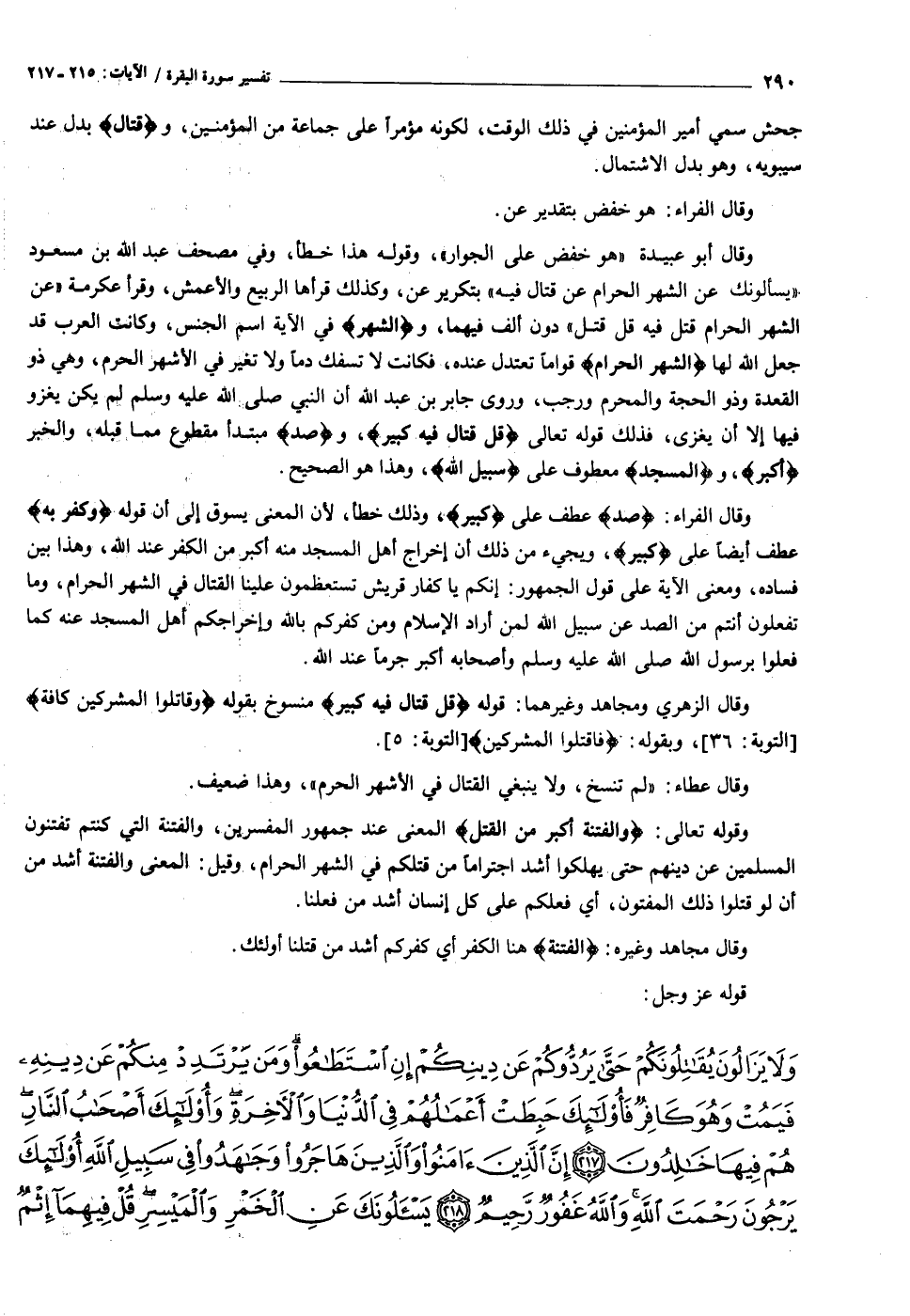 وقال أبو عبيدة «هو خفض على الجوار» ، وقوله هذا خطأ، وفي مصحف عبد الله بن مسعود «يسألونك عن الشهر الحرام عن قتال فيه» بتكرير عن، وكذلك قرأها الربيع والأعمش، وقرأ عكرمة «عن الشهر الحرام قتل فيه قل قتل» دون ألف فيهما، والشَّهْرِ في الآية اسم الجنس، وكانت العرب قد جعل الله لها الشَّهْرِ الْحَرامِ قواما تعتدل عنده، فكانت لا تسفك دما ولا تغير في الأشهر الحرم، وهي ذو القعدة وذو الحجة والمحرم ورجب، وروى جابر بن عبد الله أن النبي صلى الله عليه وسلم لم يكن يغزو فيها إلا أن يغزى، فذلك قوله تعالى قُلْ قِتالٌ فِيهِ كَبِيرٌ، وصَدٌّ مبتدأ مقطوع مما قبله، والخبر أَكْبَرُ، والْمَسْجِدِ معطوف على سَبِيلِ اللَّهِ، وهذا هو الصحيح.