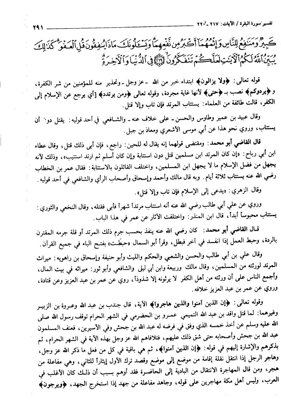قوله تعالى: وَلا يَزالُونَ ابتداء خبر من الله- عز وجل- وتحذير منه للمؤمنين من شر الكفرة، ويَرُدُّوكُمْ نصب ب حَتَّى لأنها غاية مجردة، وقوله تعالى وَمَنْ يَرْتَدِدْ [أي يرجع عن الإسلام إلى الكفر، قالت طائفة من العلماء: يستتاب المرتد فإن تاب وإلا قتل.