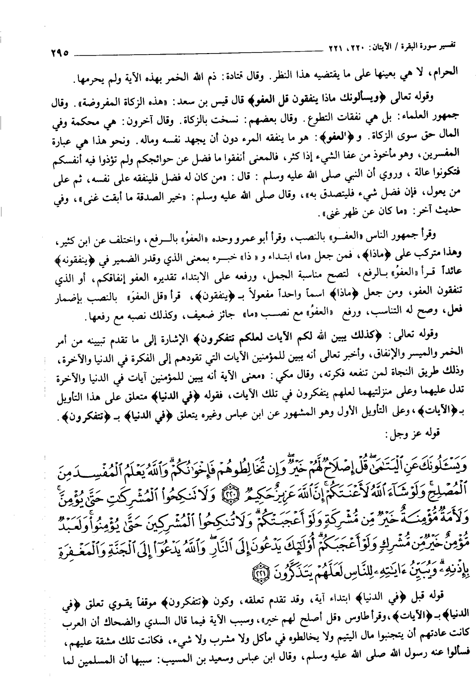 وقوله تعالى وَيَسْئَلُونَكَ ماذا يُنْفِقُونَ قُلِ الْعَفْوَ قال قيس بن سعد: «هذه الزكاة المفروضة» . وقال جمهور العلماء: بل هي نفقات التطوع. وقال بعضهم: نسخت بالزكاة. وقال آخرون: هي محكمة وفي المال حق سوى الزكاة. والْعَفْوَ: هو ما ينفقه المرء دون أن يجهد نفسه وماله. ونحو هذا هي عبارة المفسرين، وهو مأخوذ من عفا الشيء إذا كثر، فالمعنى أنفقوا ما فضل عن حوائجكم ولم تؤذوا فيه أنفسكم فتكونوا عالة، وروي أن النبي صلى الله عليه وسلم: قال: «من كان له فضل فلينفقه على نفسه، ثم على من يعول، فإن فضل شيء فليتصدق به» ، وقال صلى الله عليه وسلم: «خير الصدقة ما أبقت غنى» ، وفي حديث آخر: «ما كان عن ظهر غنى» .