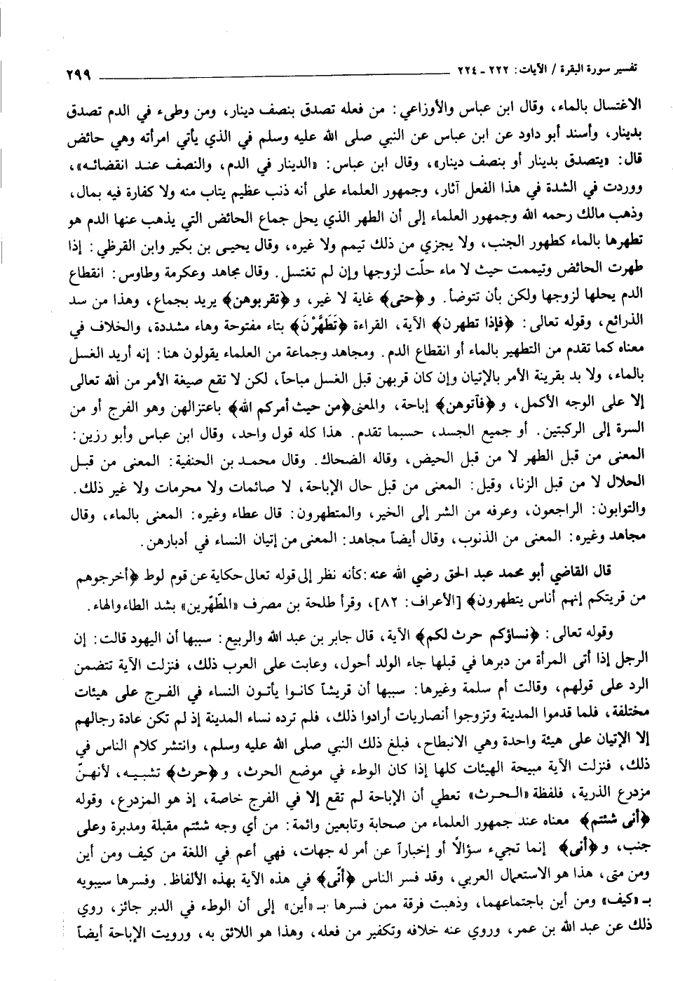 الاغتسال بالماء، وقال ابن عباس والأوزاعي: من فعله تصدق بنصف دينار، ومن وطئ في الدم تصدق بدينار، وأسند أبو داود عن ابن عباس عن النبي صلى الله عليه وسلم في الذي يأتي امرأته وهي حائض قال: «يتصدق بدينار أو بنصف دينار» ، وقال ابن عباس: «الدينار في الدم، والنصف عند انقضائه» ، ووردت في الشدة في هذا الفعل آثار، وجمهور العلماء على أنه ذنب عظيم يتاب منه ولا كفارة فيه بمال، وذهب مالك رحمه الله وجمهور العلماء إلى أن الطهر الذي يحل جماع الحائض التي يذهب عنها الدم هو تطهرها بالماء كطهور الجنب، ولا يجزي من ذلك تيمم ولا غيره، وقال يحيى بن بكير وابن القرظي: إذا طهرت الحائض وتيممت حيث لا ماء حلّت لزوجها وإن لم تغتسل. وقال مجاهد وعكرمة وطاوس: انقطاع الدم يحلها لزوجها ولكن بأن تتوضأ. وحَتَّى غاية لا غير، وتَقْرَبُوهُنَّ يريد بجماع، وهذا من سد الذرائع، وقوله تعالى: فَإِذا تَطَهَّرْنَ الآية، القراءة تَطَهَّرْنَ بتاء مفتوحة وهاء مشددة، والخلاف في معناه كما تقدم من التطهير بالماء أو انقطاع الدم. ومجاهد وجماعة من العلماء يقولون هنا: إنه أريد الغسل بالماء، ولا بد بقرينة الأمر بالإتيان وإن كان قربهن قبل الغسل مباحا، لكن لا تقع صيغة الأمر من الله تعالى إلا على الوجه الأكمل، وفَأْتُوهُنَ