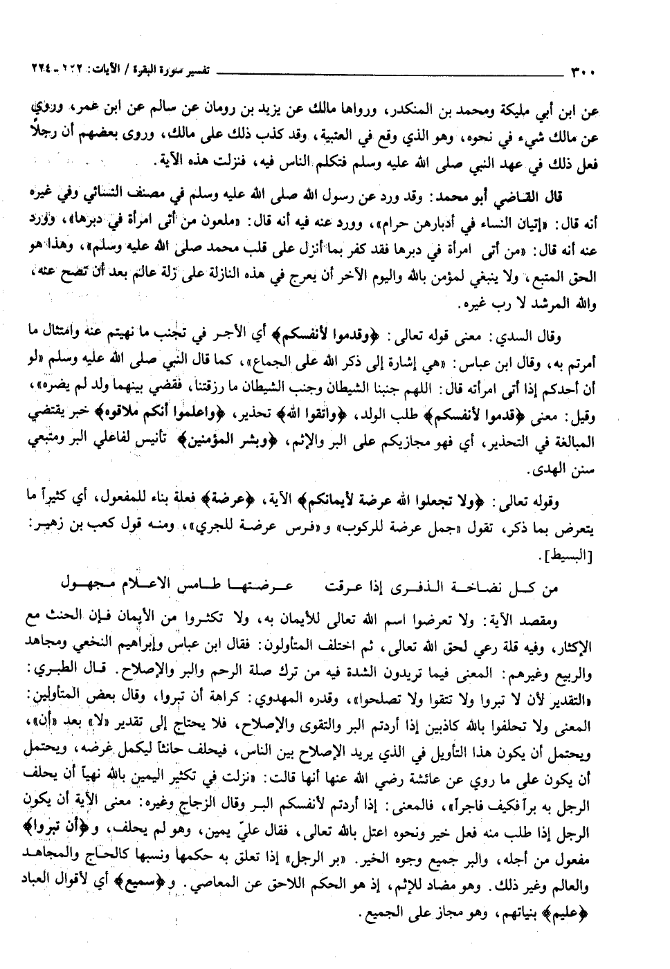 وقال السدي: معنى قوله تعالى: وَقَدِّمُوا لِأَنْفُسِكُمْ أي الأجر في تجنب ما نهيتم عنه وامتثال ما أمرتم به، وقال ابن عباس: «هي إشارة إلى ذكر الله على الجماع» ، كما قال النبي صلى الله عليه وسلم «لو أن أحدكم إذا أتى امرأته قال: اللهم جنبنا الشيطان وجنب الشيطان ما رزقتنا، فقضي بينهما ولد لم يضره» ، وقيل: معنى قَدِّمُوا لِأَنْفُسِكُمْ طلب الولد، وَاتَّقُوا اللَّهَ تحذير، وَاعْلَمُوا أَنَّكُمْ مُلاقُوهُ خبر يقتضي المبالغة في التحذير، أي فهو مجازيكم على البر والإثم، وَبَشِّرِ الْمُؤْمِنِينَ تأنيس لفاعلي البر ومتبعي سنن الهدى.