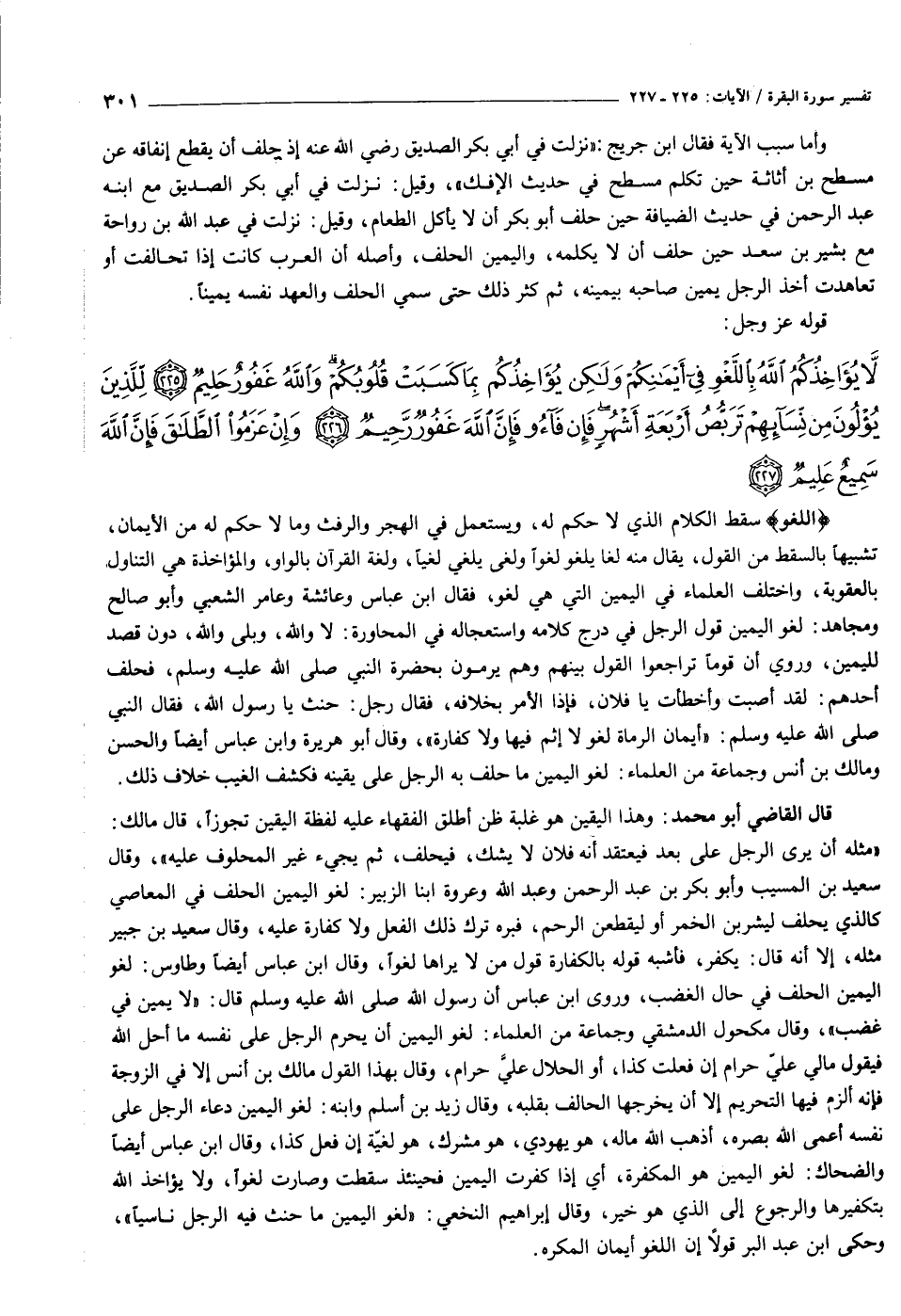 لا يُؤاخِذُكُمُ اللَّهُ بِاللَّغْوِ فِي أَيْمانِكُمْ وَلكِنْ يُؤاخِذُكُمْ بِما كَسَبَتْ قُلُوبُكُمْ وَاللَّهُ غَفُورٌ حَلِيمٌ (٢٢٥) لِلَّذِينَ يُؤْلُونَ مِنْ نِسائِهِمْ تَرَبُّصُ أَرْبَعَةِ أَشْهُرٍ فَإِنْ فاؤُ فَإِنَّ اللَّهَ غَفُورٌ رَحِيمٌ (٢٢٦) وَإِنْ عَزَمُوا الطَّلاقَ فَإِنَّ اللَّهَ سَمِيعٌ عَلِيمٌ (٢٢٧)