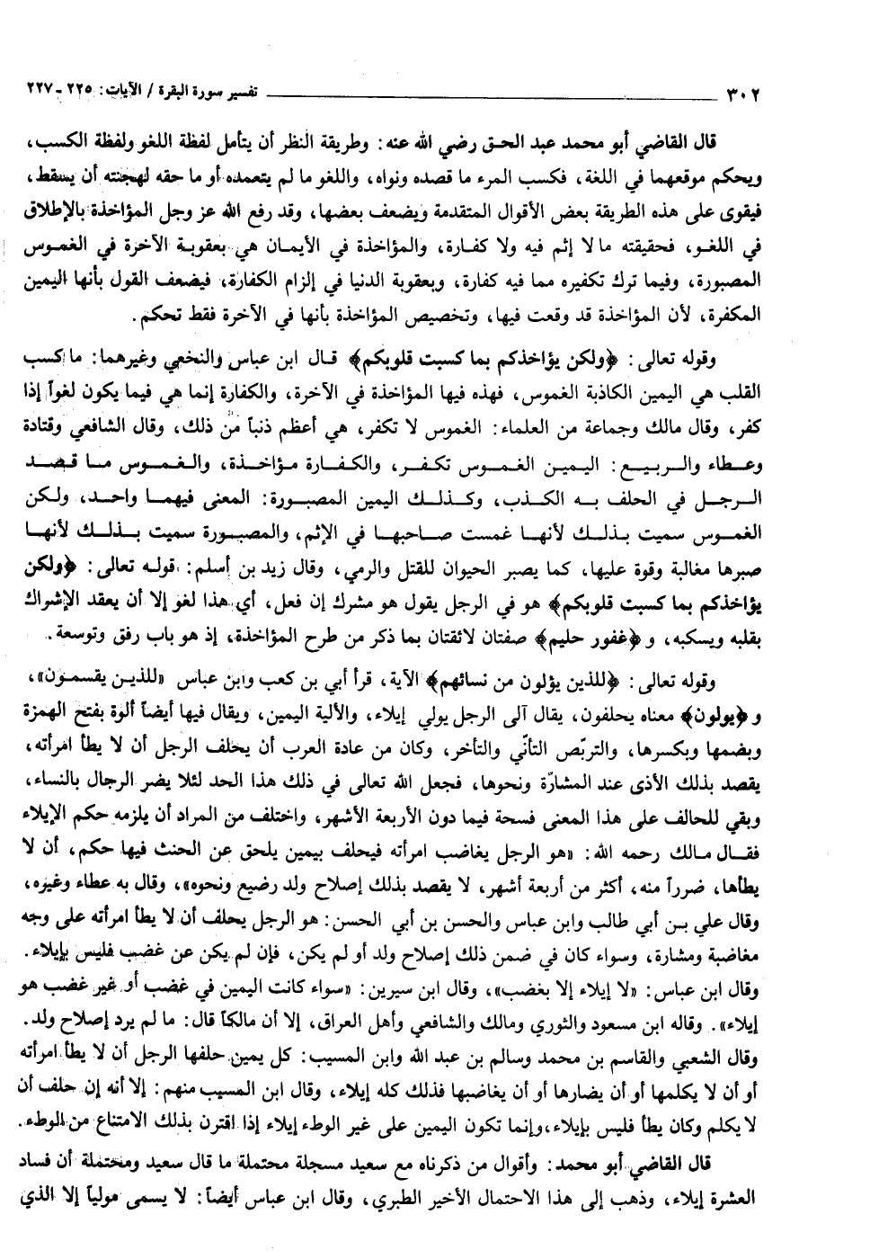 قال القاضي أبو محمد عبد الحق رضي الله عنه: وطريقة النظر أن يتأمل لفظة اللغو ولفظة الكسب، ويحكم موقعهما في اللغة، فكسب المرء ما قصده ونواه، واللغو ما لم يتعمده أو ما حقه لهجنته أن يسقط، فيقوى على هذه الطريقة بعض الأقوال المتقدمة ويضعف بعضها، وقد رفع الله عز وجل المؤاخذة بالإطلاق في اللغو، فحقيقته ما لا إثم فيه ولا كفارة، والمؤاخذة في الأيمان هي بعقوبة الآخرة في الغموس المصبورة، وفيما ترك تكفيره مما فيه كفارة، وبعقوبة الدنيا في إلزام الكفارة، فيضعف القول بأنها اليمين المكفرة، لأن المؤاخذة قد وقعت فيها، وتخصيص المؤاخذة بأنها في الآخرة فقط تحكم.