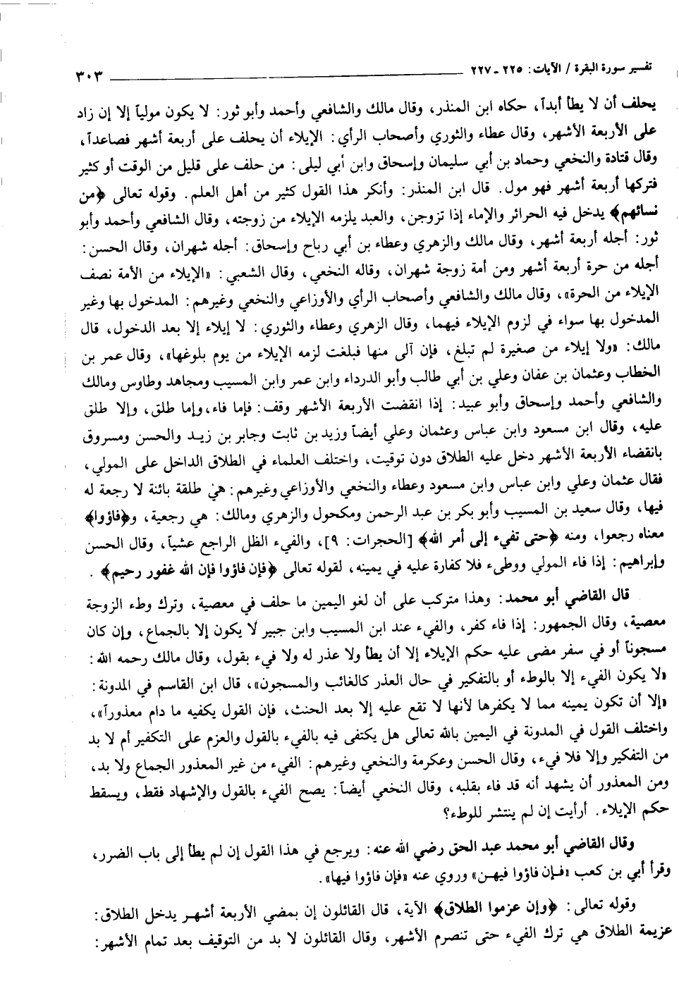 يحلف أن لا يطأ أبدا، حكاه ابن المنذر، وقال مالك والشافعي وأحمد وأبو ثور: لا يكون موليا إلا إن زاد على الأربعة الأشهر، وقال عطاء والثوري وأصحاب الرأي: الإيلاء أن يحلف على أربعة أشهر فصاعدا، وقال قتادة والنخعي وحماد بن أبي سليمان وإسحاق وابن أبي ليلى: من حلف على قليل من الوقت أو كثير فتركها أربعة أشهر فهو مول. قال ابن المنذر: وأنكر هذا القول كثير من أهل العلم. وقوله تعالى مِنْ نِسائِهِمْ يدخل فيه الحرائر والإماء إذا تزوجن، والعبد يلزمه الإيلاء من زوجته، وقال الشافعي وأحمد وأبو ثور: أجله أربعة أشهر، وقال مالك والزهري وعطاء بن أبي رباح وإسحاق: أجله شهران، وقال الحسن: