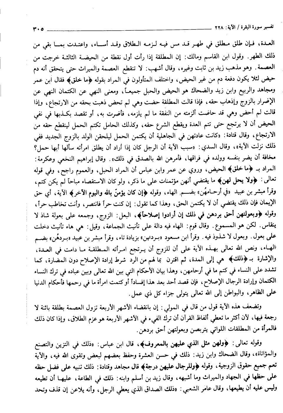 العدة، فإن طلق مطلق في طهر قد مس فيه لزمه الطلاق وقد أساء، واعتدت بما بقي من ذلك الطهر. وقول ابن القاسم ومالك: إن المطلقة إذا رأت أول نقطة من الحيضة الثالثة خرجت من العصمة. وهو مذهب زيد بن ثابت وغيره، وقال أشهب: لا تنقطع العصمة والميراث حتى يتحقق أنه دم حيض لئلا يكون دفعة دم من غير الحيض، واختلف المتأولون في المراد بقوله ما خَلَقَ فقال ابن عمر ومجاهد والربيع وابن زيد والضحاك هو الحيض والحبل جميعا، ومعنى النهي عن الكتمان النهي عن الإضرار بالزوج وإذهاب حقه، فإذا قالت المطلقة حضت وهي لم تحض ذهبت بحقه من الارتجاع، وإذا قالت لم أحض وهي قد حاضت ألزمته من النفقة ما لم يلزمه، فأضرت به، أو تقصد بكذبها في نفي الحيض أن لا يرتجع حتى تتم العدة ويقطع الشرع حقه، وكذلك الحامل تكتم الحمل لينقطع حقه من الارتجاع، وقال قتادة: «كانت عادتهن في الجاهلية أن يكتمن الحمل ليلحقن الولد بالزوج الجديد ففي ذلك نزلت الآية» ، وقال السدي: «سبب الآية أن الرجل كان إذا أراد أن يطلق امرأته سألها أبها حمل؟