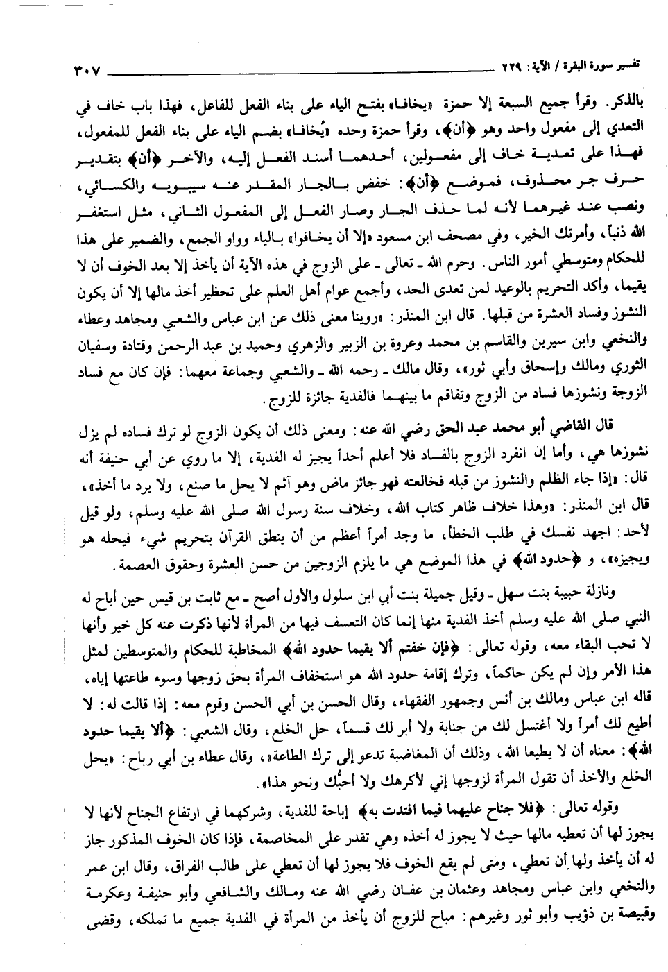 بالذكر. وقرأ جميع السبعة إلا حمزة «يخافا» بفتح الياء على بناء الفعل للفاعل، فهذا باب خاف في التعدي إلى مفعول واحد وهو أَنْ، وقرأ حمزة وحده «يخافا» بضم الياء على بناء الفعل للمفعول، فهذا على تعدية خاف إلى مفعولين، أحدهما أسند الفعل إليه، والآخر أَنْ بتقدير حرف جر محذوف، فموضع أَنْ: خفض بالجار المقدر عنه سيبويه والكسائي، ونصب عند غيرهما لأنه لما حذف الجار وصار الفعل إلى المفعول الثاني، مثل استغفر الله ذنبا، وأمرتك الخير، وفي مصحف ابن مسعود «إلا أن يخافوا» بالياء وواو الجمع، والضمير على هذا للحكام ومتوسطي أمور الناس. وحرم الله- تعالى- على الزوج في هذه الآية أن يأخذ إلا بعد الخوف أن لا يقيما، وأكد التحريم بالوعيد لمن تعدى الحد، وأجمع عوام أهل العلم على تحظير أخذ مالها إلا أن يكون النشوز وفساد العشرة من قبلها. قال ابن المنذر: «روينا معنى ذلك عن ابن عباس والشعبي ومجاهد وعطاء والنخعي وابن سيرين والقاسم بن محمد وعروة بن الزبير والزهري وحميد بن عبد الرحمن وقتادة وسفيان الثوري ومالك وإسحاق وأبي ثور» ، وقال مالك- رحمه الله- والشعبي وجماعة معهما: فإن كان مع فساد الزوجة ونشوزها فساد من الزوج وتفاقم ما بينهما فالفدية جائزة للزوج.