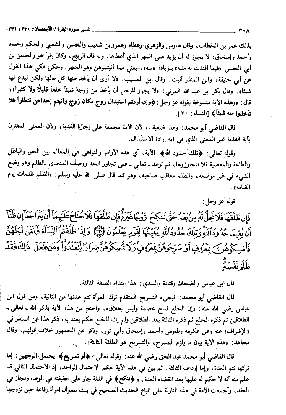 فَإِنْ طَلَّقَها فَلا تَحِلُّ لَهُ مِنْ بَعْدُ حَتَّى تَنْكِحَ زَوْجاً غَيْرَهُ فَإِنْ طَلَّقَها فَلا جُناحَ عَلَيْهِما أَنْ يَتَراجَعا إِنْ ظَنَّا أَنْ يُقِيما حُدُودَ اللَّهِ وَتِلْكَ حُدُودُ اللَّهِ يُبَيِّنُها لِقَوْمٍ يَعْلَمُونَ (٢٣٠) وَإِذا طَلَّقْتُمُ النِّساءَ فَبَلَغْنَ أَجَلَهُنَّ فَأَمْسِكُوهُنَّ بِمَعْرُوفٍ أَوْ سَرِّحُوهُنَّ بِمَعْرُوفٍ وَلا تُمْسِكُوهُنَّ ضِراراً لِتَعْتَدُوا وَمَنْ يَفْعَلْ ذلِكَ فَقَدْ ظَلَمَ نَفْسَهُ وَلا تَتَّخِذُوا آياتِ اللَّهِ هُزُواً وَاذْكُرُوا نِعْمَتَ اللَّهِ عَلَيْكُمْ وَما أَنْزَلَ عَلَيْكُمْ مِنَ الْكِتابِ وَالْحِكْمَةِ يَعِظُكُمْ بِهِ وَاتَّقُوا اللَّهَ وَاعْلَمُوا أَنَّ اللَّهَ بِكُلِّ شَيْءٍ عَلِيمٌ (٢٣١)