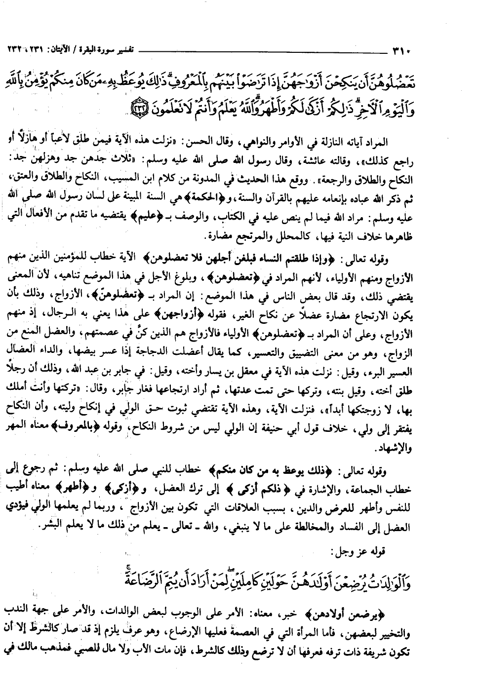 وَإِذا طَلَّقْتُمُ النِّساءَ فَبَلَغْنَ أَجَلَهُنَّ فَلا تَعْضُلُوهُنَّ أَنْ يَنْكِحْنَ أَزْواجَهُنَّ إِذا تَراضَوْا بَيْنَهُمْ بِالْمَعْرُوفِ ذلِكَ يُوعَظُ بِهِ مَنْ كانَ مِنْكُمْ يُؤْمِنُ بِاللَّهِ وَالْيَوْمِ الْآخِرِ ذلِكُمْ أَزْكى لَكُمْ وَأَطْهَرُ وَاللَّهُ يَعْلَمُ وَأَنْتُمْ لا تَعْلَمُونَ (٢٣٢)