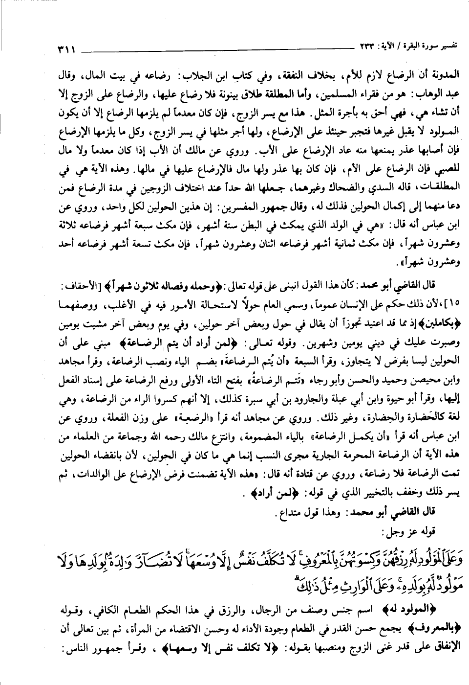 وَعَلَى الْمَوْلُودِ لَهُ رِزْقُهُنَّ وَكِسْوَتُهُنَّ بِالْمَعْرُوفِ لا تُكَلَّفُ نَفْسٌ إِلَّا وُسْعَها لا تُضَارَّ والِدَةٌ بِوَلَدِها وَلا مَوْلُودٌ لَهُ بِوَلَدِهِ وَعَلَى الْوارِثِ مِثْلُ ذلِكَ الْمَوْلُودِ لَهُ اسم جنس وصنف من الرجال، والرزق في هذا الحكم الطعام الكافي، وقوله بِالْمَعْرُوفِ يجمع حسن القدر في الطعام وجودة الأداء له وحسن الاقتضاء من المرأة، ثم بين تعالى أن الإنفاق على قدر غنى الزوج ومنصبها بقوله: لا تُكَلَّفُ نَفْسٌ إِلَّا وُسْعَها، وقرأ جمهور الناس: