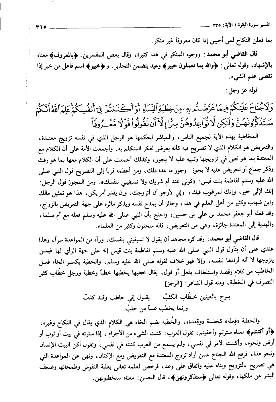 وَلا جُناحَ عَلَيْكُمْ فِيما عَرَّضْتُمْ بِهِ مِنْ خِطْبَةِ النِّساءِ أَوْ أَكْنَنْتُمْ فِي أَنْفُسِكُمْ عَلِمَ اللَّهُ أَنَّكُمْ سَتَذْكُرُونَهُنَّ وَلكِنْ لا تُواعِدُوهُنَّ سِرًّا إِلاَّ أَنْ تَقُولُوا قَوْلاً مَعْرُوفاً وَلا تَعْزِمُوا عُقْدَةَ النِّكاحِ حَتَّى يَبْلُغَ الْكِتابُ أَجَلَهُ وَاعْلَمُوا أَنَّ اللَّهَ يَعْلَمُ ما فِي أَنْفُسِكُمْ فَاحْذَرُوهُ وَاعْلَمُوا أَنَّ اللَّهَ غَفُورٌ حَلِيمٌ (٢٣٥)