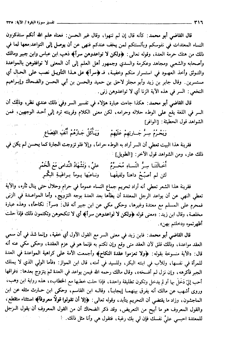 فقرينة هذا الشعر تعطي أنه أراد تحريم جماع النساء عموما في حرام وحلال حتى ينال ثأره، والآية تعطي النهي عن أن يواعد الرجل المعتدة أن يطأها بعد العدة بوجه التزويج، وأما المواعدة في الزنى فمحرم على المسلم مع معتدة وغيرها، وحكى مكي عن ابن جبير أنه قال: «سرا: نكاحا» ، وهذه عبارة مخلصة، وقال ابن زيد: «معنى قوله وَلكِنْ لا تُواعِدُوهُنَّ سِرًّا أي لا تنكحوهن وتكتمون ذلك فإذا حلت أظهر تموه ودخلتم بهن» .