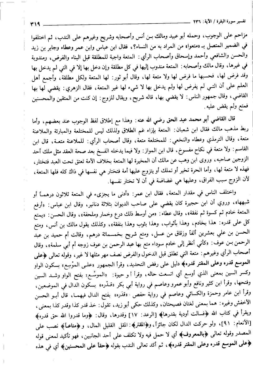 واختلف الناس في مقدار المتعة، فقال ابن عمر: «أدنى ما يجزىء في المتعة ثلاثون درهما أو شبهها» ، وروي أن ابن حجيرة كان يقضي على صاحب الديوان بثلاثة دنانير، وقال ابن عباس: «أرفع المتعة خادم ثم كسوة ثم نفقة» ، وقال عطاء: «من أوسط ذلك درع وخمار وملحفة» ، وقال الحسن: «يمتع كل على قدره: هذا بخادم، وهذا بأثواب، وهذا بثوب وهذا بنفقة» ، وكذلك يقول مالك بن أنس، ومتع الحسن بن علي بعشرين ألفا وزقاق من عسل، ومتع شريح بخمسمائة درهم، وقالت أم حميد بن عبد الرحمن بن عوف: «كأني أنظر إلى خادم سوداء متع بها عبد الرحمن بن عوف زوجه أم أبي سلمة» ، وقال أصحاب الرأي وغيرهم: متعة التي تطلق قبل الدخول والفرض نصف مهر مثلها لا غير، وقوله تعالى عَلَى الْمُوسِعِ قَدَرُهُ وَعَلَى الْمُقْتِرِ قَدَرُهُ دليل على رفض التحديد، وقرأ الجمهور «على الموسع» بسكون الواو وكسر السين بمعنى الذي أوسع أي اتسعت حاله، وقرأ أو حيوة: «الموسّع» بفتح الواو وشد السين وفتحها، وقرأ ابن كثير ونافع وأبو عمرو وعاصم في رواية أبي بكر «قدره» بسكون الدال في الموضعين، وقرأ ابن عامر وحمزة والكسائي وعاصم في رواية حفص «قدره» بفتح الدال فيهما، قال أبو الحسن الأخفش وغيره: هما بمعنى لغتان فصيحتان، وكذلك حكى أبو زيد، تقول: خذ قدر كذا وقدر كذا بمعنى، ويقرأ في كتاب الله فَسالَتْ أَوْدِيَةٌ بِقَدَرِها [الرعد: ١٧] وقدرها، وقال: وَما قَدَرُوا اللَّهَ حَقَّ قَدْرِهِ [الأنعام: ٩١] ، ولو حركت الدال لكان جائزا، والْمُقْتِرِ: المقل القليل المال، ومَتاعاً نصب على المصدر وقوله تعالى بِالْمَعْرُوفِ أي لا حمل فيه ولا تكلف على أحد الجانبين، فهو تأكيد لمعنى قوله عَلَى الْمُوسِعِ قَدَرُهُ وَعَلَى الْمُقْتِرِ قَدَرُهُ، ثم أكد تعالى الندب بقوله حَقًّا عَلَى الْمُحْسِنِينَ أي في هذه