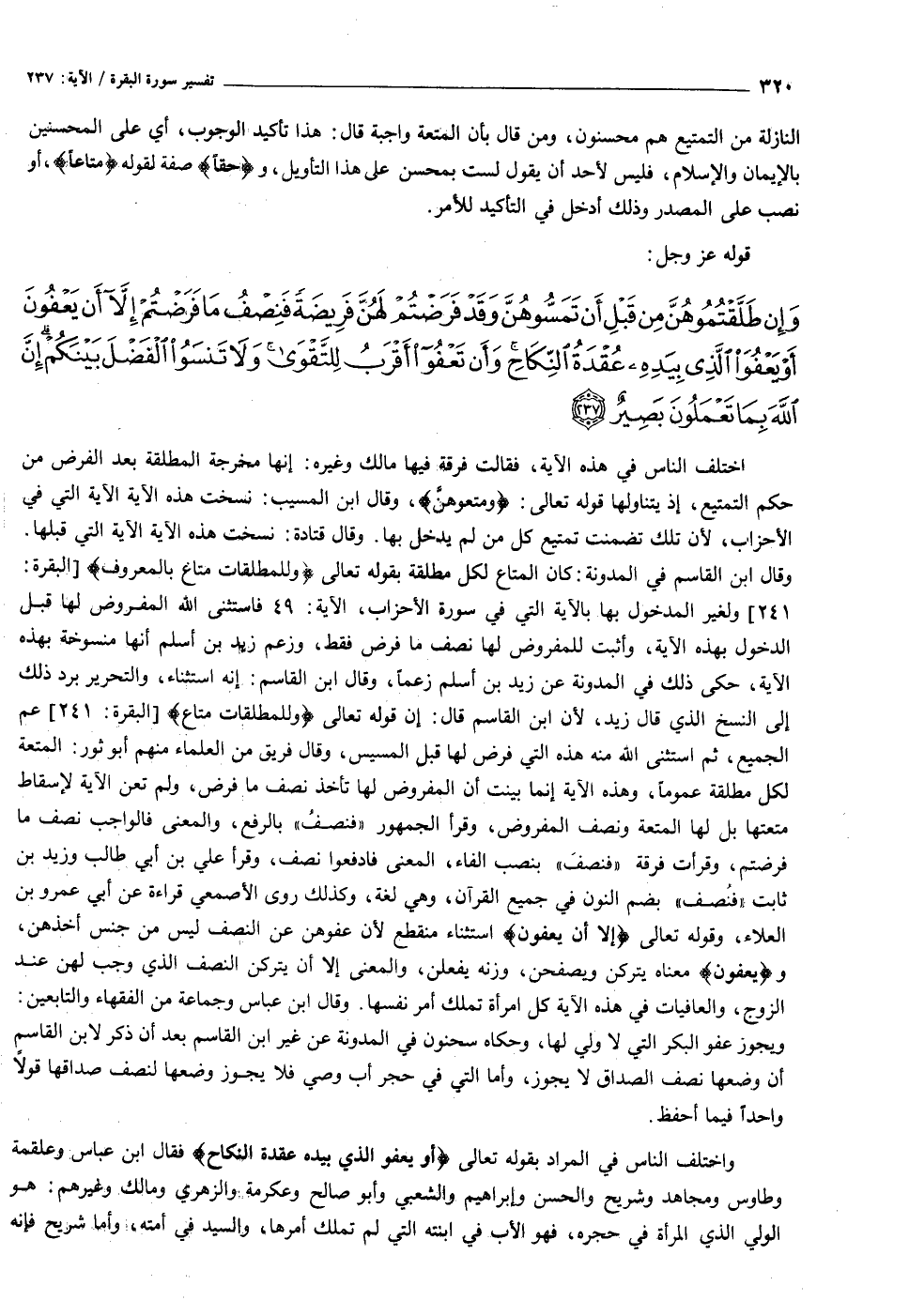 وَإِنْ طَلَّقْتُمُوهُنَّ مِنْ قَبْلِ أَنْ تَمَسُّوهُنَّ وَقَدْ فَرَضْتُمْ لَهُنَّ فَرِيضَةً فَنِصْفُ ما فَرَضْتُمْ إِلاَّ أَنْ يَعْفُونَ أَوْ يَعْفُوَا الَّذِي بِيَدِهِ عُقْدَةُ النِّكاحِ وَأَنْ تَعْفُوا أَقْرَبُ لِلتَّقْوى وَلا تَنْسَوُا الْفَضْلَ بَيْنَكُمْ إِنَّ اللَّهَ بِما تَعْمَلُونَ بَصِيرٌ (٢٣٧)