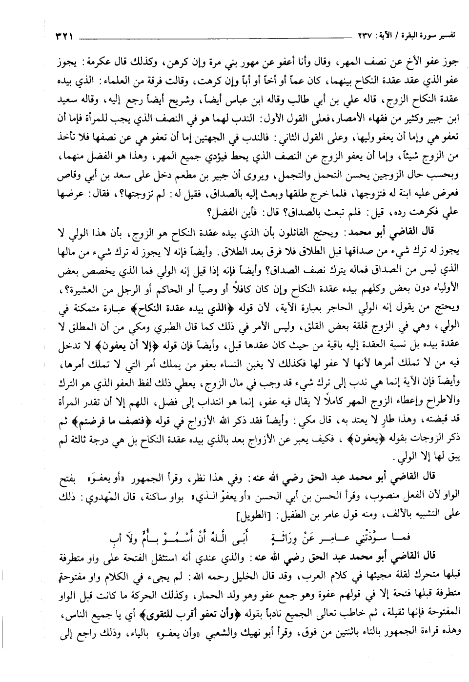 قال القاضي أبو محمد عبد الحق رضي الله عنه: وفي هذا نظر، وقرأ الجمهور «أو يعفو» بفتح الواو لأن الفعل منصوب، وقرأ الحسن بن أبي الحسن «أو يعفو الذي» بواو ساكنة، قال المهدوي: ذلك على التشبيه بالألف، ومنه قول عامر بن الطفيل: [الطويل]
