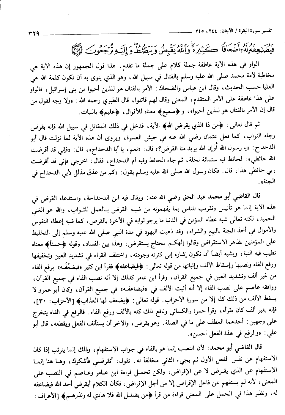 قال القاضي أبو محمد عبد الحق رضي الله عنه: ويقال فيه ابن الدحداحة، واستدعاء القرض في هذه الآية إنما هو تأنيس وتقريب للناس بما يفهمونه من شبه القرض بالعمل للثواب، والله هو الغني الحميد، لكنه تعالى شبه عطاء المؤمن في الدنيا ما يرجو ثوابه في الآخرة بالقرض، كما شبه إعطاء النفوس والأموال في أخذ الجنة بالبيع والشراء، وقد ذهبت اليهود في مدة النبي صلى الله عليه وسلم إلى التخليط على المؤمنين بظاهر الاستقراض وقالوا إلهكم محتاج يستقرض، وهذا بين الفساد، وقوله حَسَناً معناه تطيب فيه النية، ويشبه أيضا أن تكون إشارة إلى كثرته وجودته، واختلف القراء في تشديد العين وتخفيفها ورفع الفاء ونصبها وإسقاط الألف وإثباتها من قوله تعالى: فَيُضاعِفَهُ فقرأ ابن كثير «فيضعّفه» برفع الفاء من غير ألف وتشديد العين في جميع القرآن، وقرأ ابن عامر كذلك إلا أنه نصب الفاء في جميع القرآن، ووافقه عاصم على نصب الفاء إلا أنه أثبت الألف في «فيضاعفه» في جميع القرآن، وكان أبو عمرو لا يسقط الألف من ذلك كله إلا من سورة الأحزاب. قوله تعالى: يُضاعَفْ لَهَا الْعَذابُ [الأحزاب: ٣٠] ، فإنه بغير ألف كان يقرأه، وقرأ حمزة والكسائي ونافع ذلك كله بالألف ورفع الفاء، فالرفع في الفاء يتخرج على وجهين: أحدهما العطف على ما في الصلة. وهو يقرض، والآخر أن يستأنف الفعل ويقطعه، قال أبو علي: «والرفع في هذا الفعل أحسن» .