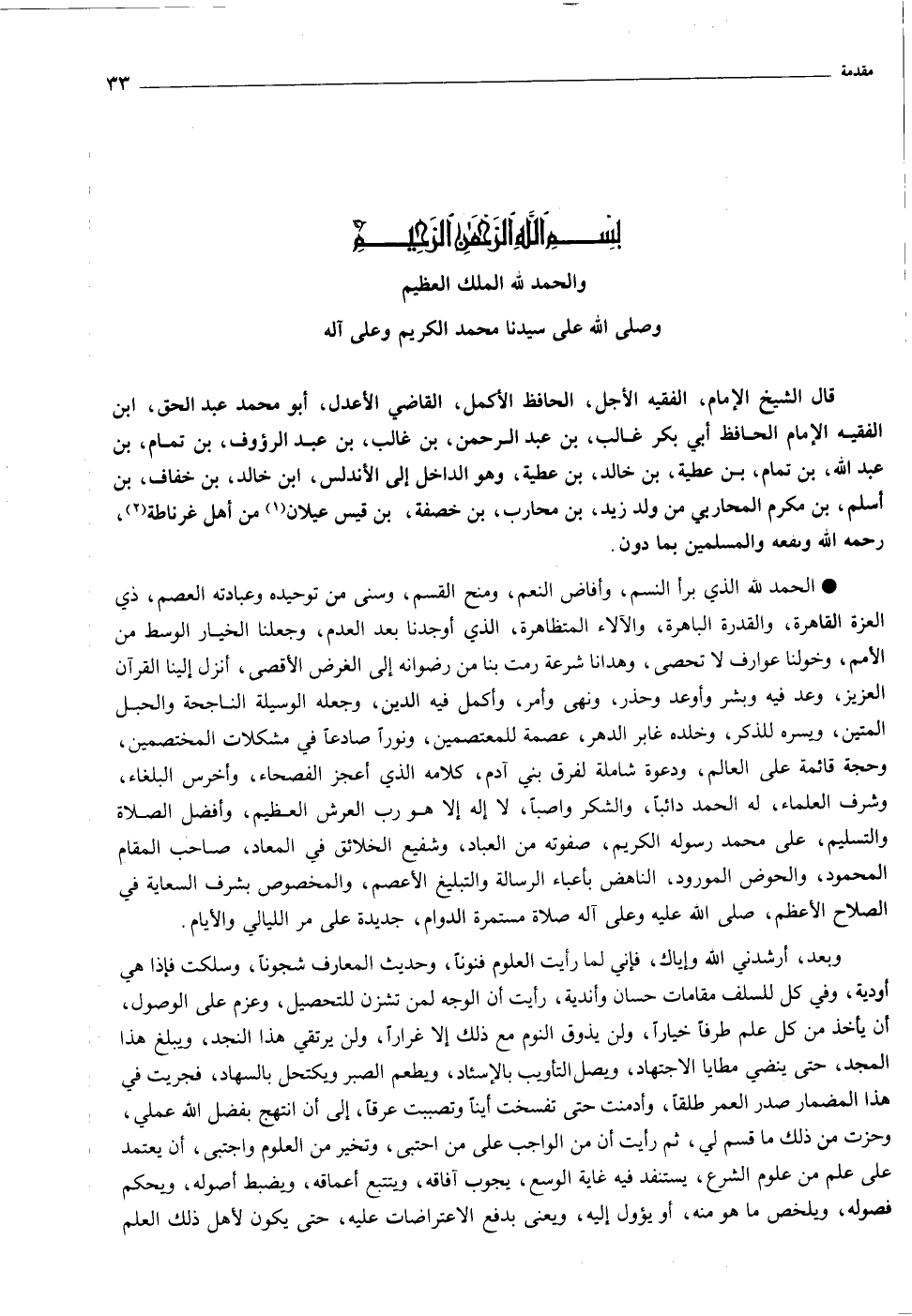 بسم الله الرّحمن الرّحيم والحمد لله الملك العظيم وصلى الله على سيدنا محمد الكريم وعلى آله قال الشيخ الإمام، الفقيه الأجل، الحافظ الأكمل، القاضي الأعدل، أبو محمد عبد الحق، ابن الفقيه الإمام الحافظ أبي بكر غالب، بن عبد الرحمن، بن غالب، بن عبد الرؤوف، بن تمام، بن عبد الله، بن تمام، بن عطية، بن خالد، بن عطية، وهو الداخل إلى الأندلس، ابن خالد، بن خفاف، بن أسلم، بن مكرم المحاربي من ولد زيد، بن محارب، بن خصفة، بن قيس عيلان من أهل غرناطة، رحمه الله ونفعه والمسلمين بما دون.