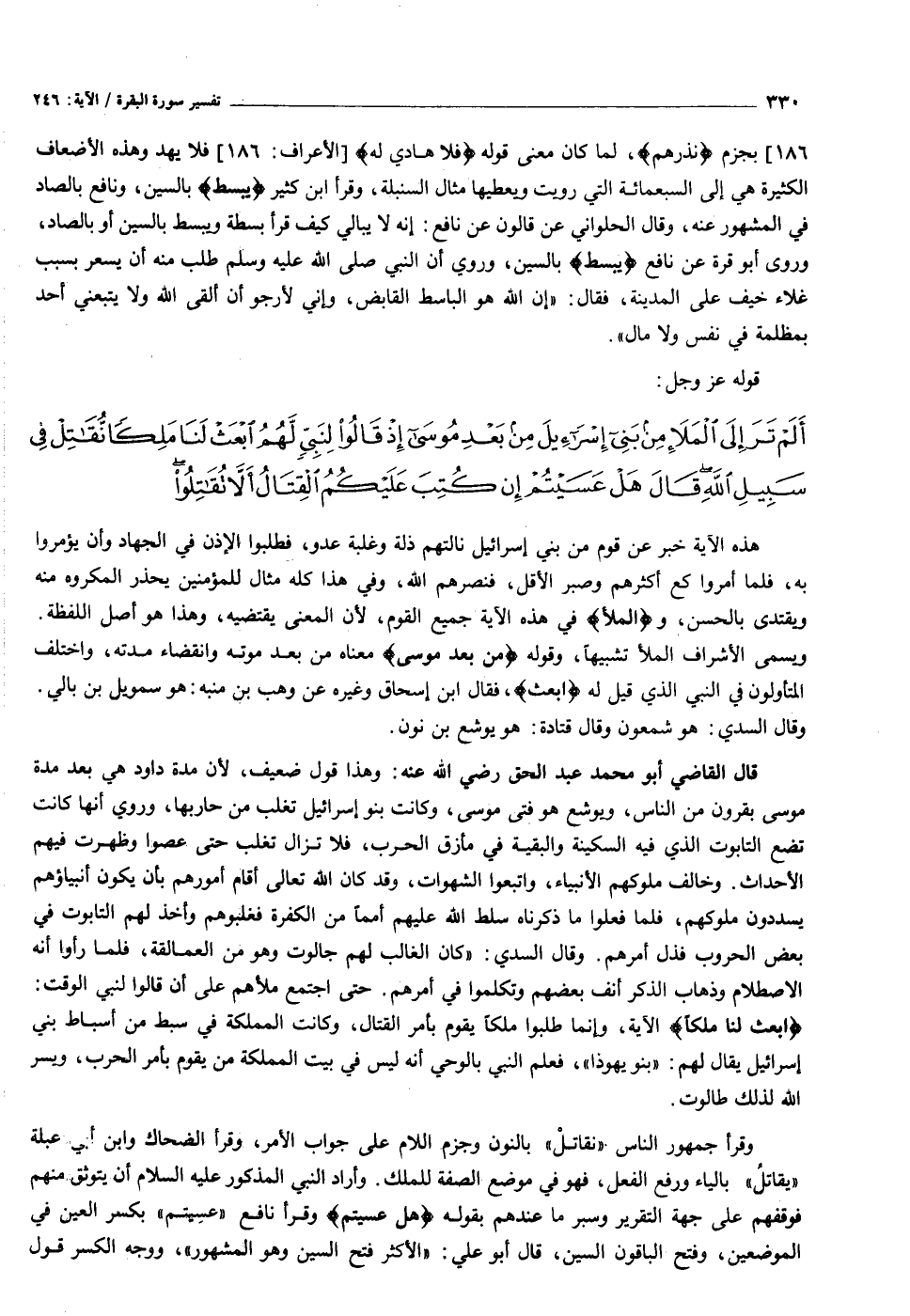 ابْعَثْ لَنا مَلِكاً الآية، وإنما طلبوا ملكا يقوم بأمر القتال، وكانت المملكة في سبط من أسباط بني إسرائيل يقال لهم: «بنو يهوذا» ، فعلم النبي بالوحي أنه ليس في بيت المملكة من يقوم بأمر الحرب، ويسر الله لذلك طالوت.
