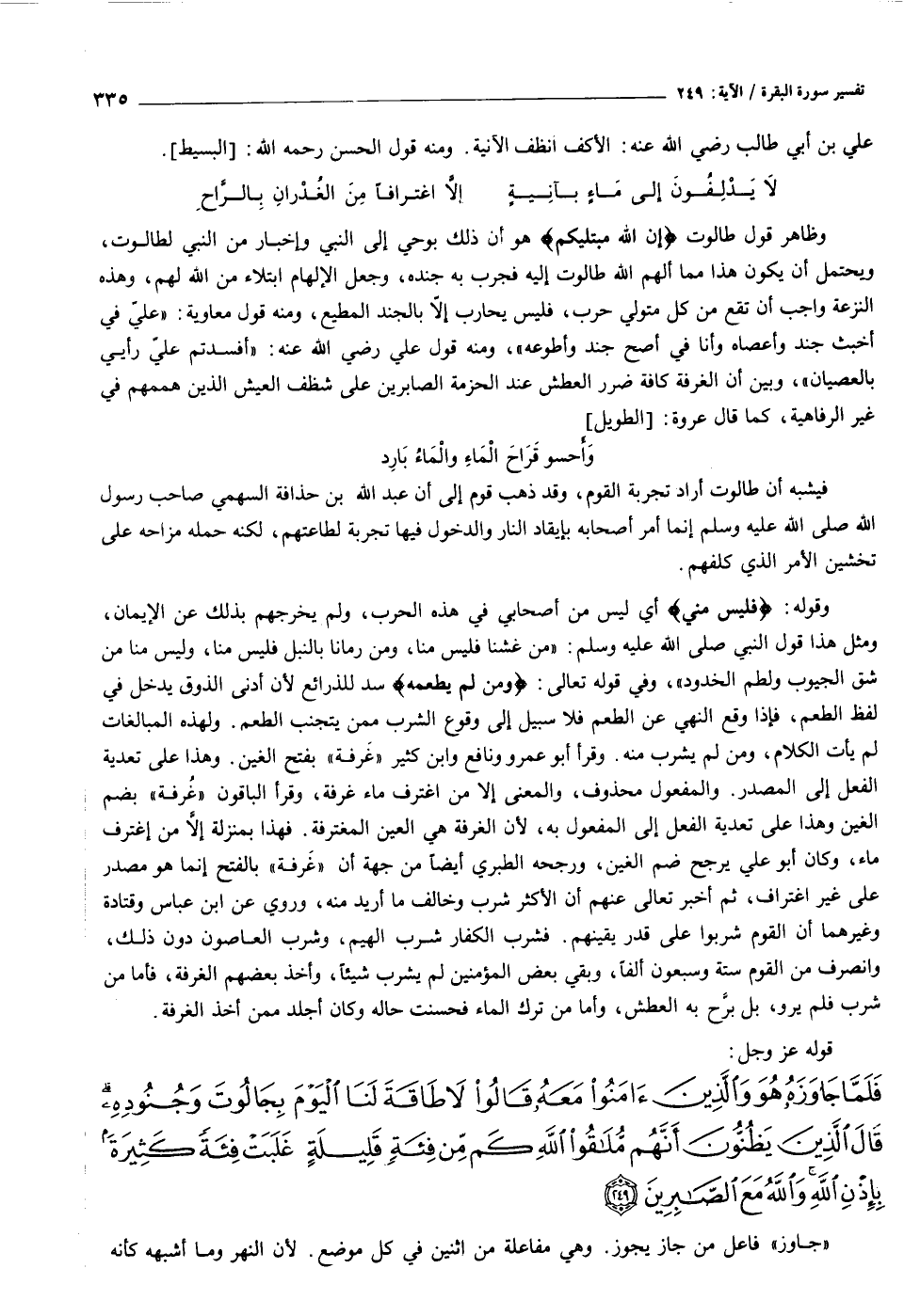 وقوله: فَلَيْسَ مِنِّي أي ليس من أصحابي في هذه الحرب، ولم يخرجهم بذلك عن الإيمان، ومثل هذا قول النبي صلى الله عليه وسلم: «من غشنا فليس منا، ومن رمانا بالنبل فليس منا، وليس منا من شق الجيوب ولطم الخدود» ، وفي قوله تعالى: وَمَنْ لَمْ يَطْعَمْهُ سد للذرائع لأن أدنى الذوق يدخل في لفظ الطعم، فإذا وقع النهي عن الطعم فلا سبيل إلى وقوع الشرب ممن يتجنب الطعم. ولهذه المبالغات لم يأت الكلام، ومن لم يشرب منه. وقرأ أبو عمرو ونافع وابن كثير «غرفة» بفتح الغين. وهذا على تعدية الفعل إلى المصدر. والمفعول محذوف، والمعنى إلا من اغترف ماء غرفة، وقرأ الباقون «غرفة» بضم الغين وهذا على تعدية الفعل إلى المفعول به، لأن الغرفة هي العين المغترفة. فهذا بمنزلة إلّا من اغترف ماء، وكان أبو علي يرجح ضم الغين، ورجحه الطبري أيضا من جهة أن «غرفة» بالفتح إنما هو مصدر على غير اغتراف، ثم أخبر تعالى عنهم أن الأكثر شرب وخالف ما أريد منه، وروي عن ابن عباس وقتادة وغيرهما أن القوم شربوا على قدر يقينهم. فشرب الكفار شرب الهيم، وشرب العاصون دون ذلك، وانصرف من القوم ستة وسبعون ألفا، وبقي بعض المؤمنين لم يشرب شيئا، وأخذ بعضهم الغرفة، فأما من شرب فلم يرو، بل برّح به العطش، وأما من ترك الماء فحسنت حاله وكان أجلد ممن أخذ الغرفة.
