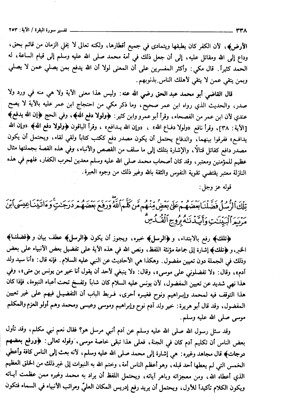 تِلْكَ الرُّسُلُ فَضَّلْنا بَعْضَهُمْ عَلى بَعْضٍ مِنْهُمْ مَنْ كَلَّمَ اللَّهُ وَرَفَعَ بَعْضَهُمْ دَرَجاتٍ وَآتَيْنا عِيسَى ابْنَ مَرْيَمَ الْبَيِّناتِ وَأَيَّدْناهُ بِرُوحِ الْقُدُسِ وَلَوْ شاءَ اللَّهُ مَا اقْتَتَلَ الَّذِينَ مِنْ بَعْدِهِمْ مِنْ بَعْدِ ما جاءَتْهُمُ الْبَيِّناتُ وَلكِنِ اخْتَلَفُوا فَمِنْهُمْ مَنْ آمَنَ وَمِنْهُمْ مَنْ كَفَرَ وَلَوْ شاءَ اللَّهُ مَا اقْتَتَلُوا وَلكِنَّ اللَّهَ يَفْعَلُ ما يُرِيدُ (٢٥٣)