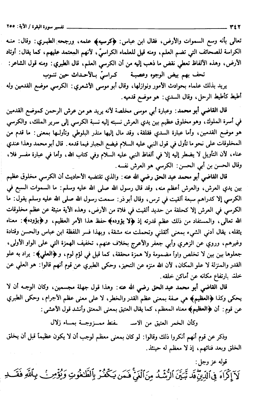 قال القاضي أبو محمد عبد الحق رضي الله عنه: والذي تقتضيه الأحاديث أن الكرسي مخلوق عظيم بين يدي العرش، والعرش أعظم منه، وقد قال رسول الله صلى الله عليه وسلم: ما السموات السبع في الكرسي إلا كدراهم سبعة ألقيت في ترس، وقال أبوذر: سمعت رسول الله صلى الله عليه وسلم يقول: ما الكرسي في العرش إلا كحلقة من حديد ألقيت في فلاة من الأرض، وهذه الآية منبئة عن عظم مخلوقات الله تعالى، والمستفاد من ذلك عظم قدرته إذ لا يَؤُدُهُ حفظ هذا الأمر العظيم، ويَؤُدُهُ: معناه يثقله، يقال آدني الشيء بمعنى أثقلني وتحملت منه مشقة، وبهذا فسر اللفظة ابن عباس والحسن وقتادة وغيرهم، وروي عن الزهري وأبي جعفر والأعرج بخلاف عنهم، تخفيف الهمزة التي على الواو الأولى، جعلوها بين بين لا تخلص واوا مضمومة ولا همزة محققة، كما قيل في لؤم لوم، والْعَلِيُّ: يراد به علو القدر والمنزلة لا علو المكان، لأن الله منزه عن التحيز، وحكى الطبري عن قوم أنهم قالوا: هو العلي عن خلقه بارتفاع مكانه عن أماكن خلقه.
