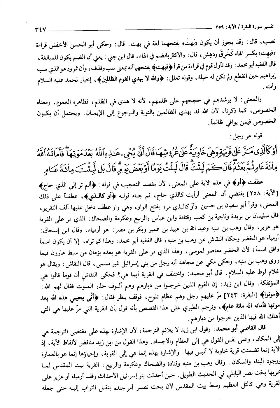 قال القاضي أبو محمد: وقول ابن زيد لا يلائم الترجمة، لأن الإشارة بهذه على مقتضى الترجمة هي إلى المكان، وعلى نفس القول هي إلى العظام والأجساد. وهذا القول من ابن زيد مناقض لألفاظ الآية، إذ الآية إنما تضمنت قرية خاوية لا أنيس فيها. والإشارة بهذه إنما هي إلى القرية، وإحياؤها إنما هو بالعمارة ووجود البناء والسكان. وقال وهب بن منبه وقتادة والضحاك وعكرمة والربيع: القرية بيت المقدس لما خربها بخت نصر البابلي في الحديث الطويل. حين أحدثت بنو إسرائيل الأحداث وقف أرمياء أو عزير على القرية وهي كالتل العظيم وسط بيت المقدس لأن بخت نصر أمر جنده بنقل التراب إليه حتى جعله