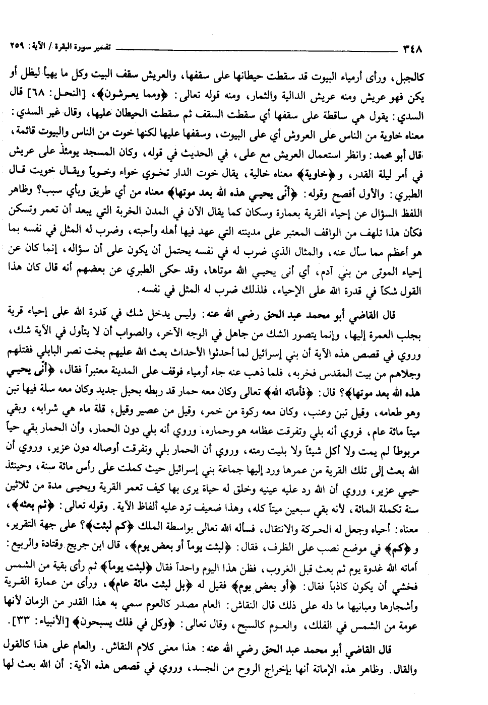 معناه خاوية من الناس على العروش أي على البيوت، وسقفها عليها لكنها خوت من الناس والبيوت قائمة، قال أبو محمد: وانظر استعمال العريش مع على، في الحديث في قوله، وكان المسجد يومئذ على عريش في أمر ليلة القدر، وخاوِيَةٌ معناه خالية، يقال خوت الدار تخوي خواء وخويا ويقال خويت قال الطبري: والأول أفصح وقوله: أَنَّى يُحْيِي هذِهِ اللَّهُ بَعْدَ مَوْتِها معناه من أي طريق وبأي سبب؟ وظاهر اللفظ السؤال عن إحياء القرية بعمارة وسكان كما يقال الآن في المدن الخربة التي يبعد أن تعمر وتسكن فكأن هذا تلهف من الواقف المعتبر على مدينته التي عهد فيها أهله وأحبته، وضرب له المثل في نفسه بما هو أعظم مما سأل عنه، والمثال الذي ضرب له في نفسه يحتمل أن يكون على أن سؤاله، إنما كان عن إحياء الموتى من بني آدم، أي أنى يحيي الله موتاها، وقد حكى الطبري عن بعضهم أنه قال كان هذا القول شكا في قدرة الله على الإحياء، فلذلك ضرب له المثل في نفسه.