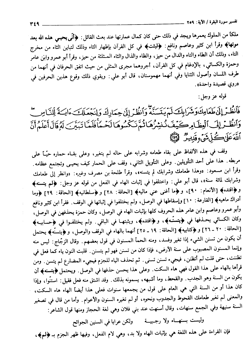وقرأ ابن مسعود: «وهذا طعامك وشرابك لم يتسنه» ، وقرأ طلحة بن مصرف وغيره: «وانظر إلى طعامك وشرابك لمائة سنة» ، قال أبو علي: واختلفوا في إثبات الهاء في الفعل من قوله عز وجل: لَمْ يَتَسَنَّهْ واقْتَدِهْ [الأنعام: ٩٠] ، وما أَغْنى عَنِّي مالِيَهْ [الحاقة: ٢٨] وسُلْطانِيَهْ [الحاقة: ٢٩] وَما أَدْراكَ ما هِيَهْ [القارعة: ١٠] وإسقاطها في الوصل، ولم يختلفوا في إثباتها في الوقف. فقرأ ابن كثير ونافع وأبو عمرو وعاصم وابن عامر هذه الحروف كلها بإثبات الهاء في الوصل، وكان حمزة يحذفهن في الوصل، وكان الكسائي يحذفها في يَتَسَنَّهْ، واقْتَدِهْ، ويثبتها في الباقي. ولم يختلفوا في حِسابِيَهْ [الحاقة: ٢٠- ٢٦] وكِتابِيَهْ [الحاقة: ١٩- ٢٥] أنهما بالهاء في الوقف والوصل، ويَتَسَنَّهْ يحتمل أن يكون من تسنن الشيء إذا تغير وفسد، ومنه الحمأ المسنون في قول بعضهم. وقال الزجّاج: ليس منه وإنما المسنون المصبوب على سنة الأرض، فإذا كان من تسنن فهو لم يتسنن. قلبت النون ياء كما فعل في تظننت، حتى قلت لم أتظنن، فيجيء تسنن تسنى. ثم تحذف الياء للجزم فيجيء المضارع لم يتسن. ومن قرأها بالهاء على هذا القول فهي هاء السكت. وعلى هذا يحسن حذفها في الوصل. ويحتمل يَتَسَنَّهْ أن يكون من السنة وهو الجدب. والقحط، وما أشبهه، يسمونه بذلك. وقد اشتق منه فعل فقيل: استنّوا، وإذا كان هذا أو من السنة التي هي العام على قول من يجمعها سنوات فعلى هذا أيضا الهاء هاء السكت، والمعنى لم تغير طعامك القحوط والجدوب ونحوه، أو لم تغيره السنون والأعوام. وأما من قال في تصغير السنة سنيهة وفي الجمع سنهات، وقال أسنهت عند بني فلان وهي لغة الحجاز ومنها قول الشاعر:
