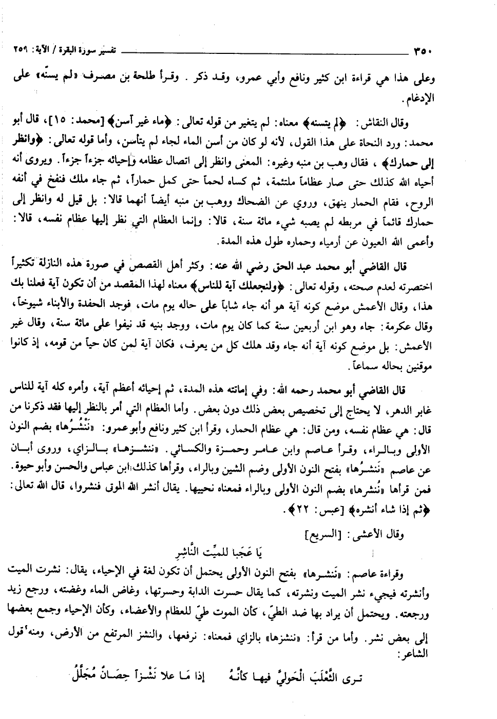 وقال الأعشى: [السريع] يا عجبا للميّت النّاشر وقراءة عاصم: «ننشرها» بفتح النون الأولى يحتمل أن تكون لغة في الإحياء، يقال: نشرت الميت وأنشرته فيجيء نشر الميت ونشرته، كما يقال حسرت الدابة وحسرتها، وغاض الماء وغضته، ورجع زيد ورجعته. ويحتمل أن يراد بها ضد الطيّ، كأن الموت طيّ للعظام والأعضاء، وكأن الإحياء وجمع بعضها إلى بعض نشر. وأما من قرأ: «ننشزها» بالزاي فمعناه: نرفعها، والنشز المرتفع من الأرض، ومنه قول الشاعر:
