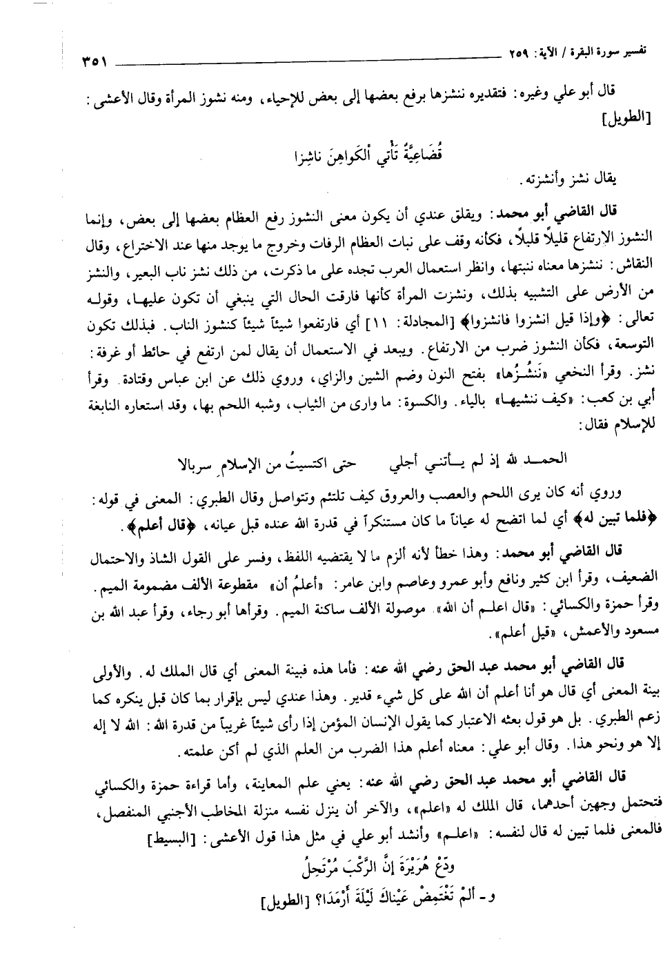قال القاضي أبو محمد عبد الحق رضي الله عنه: يعني علم المعاينة، وأما قراءة حمزة والكسائي فتحتمل وجهين أحدهما، قال الملك له «اعلم» ، والآخر أن ينزل نفسه منزلة المخاطب الأجنبي المنفصل، فالمعنى فلما تبين له قال لنفسه: «اعلم» وأنشد أبو علي في مثل هذا قول الأعشى: [البسيط] ودّع هريرة إنّ الرّكب مرتحل وألم تغتمض عيناك ليلة أرمدا؟ [الطويل]