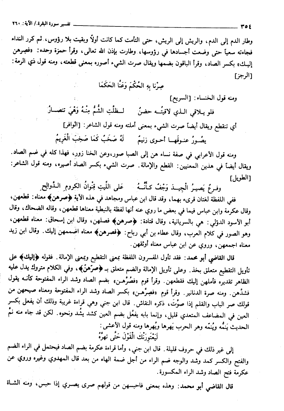 ففي اللفظة لغتان قرىء بهما، وقد قال ابن عباس ومجاهد في هذه الآية «صرهن» معناه: قطعهن، وقال عكرمة وابن عباس فيما في بعض ما روي عنه أنها لفظة بالنبطية معناها قطعهن، وقاله الضحاك، وقال أبو الأسواد الدؤلي: هي بالسريانية، وقال قتادة: «صرهن» فصلهن، وقال ابن إسحاق: معناه قطعهن، وهو الصور في كلام العرب، وقال عطاء بن أبي رباح: فَصُرْهُنَّ معناه اضممهن إليك. وقال ابن زيد معناه اجمعهن، وروي عن ابن عباس معناه أوثقهن.