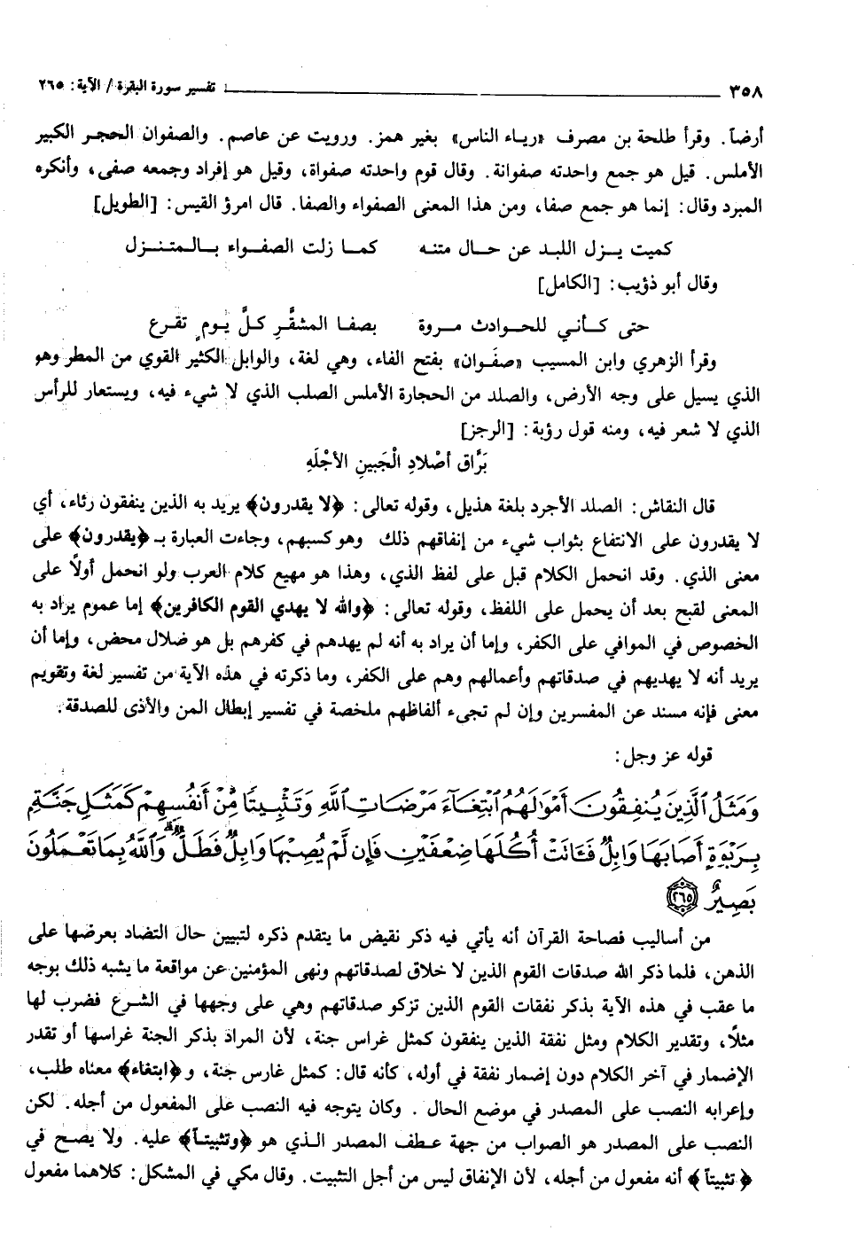 وقرأ الزهري وابن المسيب «صفوان» بفتح الفاء، وهي لغة، والوابل الكثير القوي من المطر وهو الذي يسيل على وجه الأرض، والصلد من الحجارة الأملس الصلب الذي لا شيء فيه، ويستعار للرأس الذي لا شعر فيه، ومنه قول رؤبة: [الرجز] برّاق أصلاد الجبين الأجله قال النقاش: الصلد الأجرد بلغة هذيل، وقوله تعالى: لا يَقْدِرُونَ يريد به الذين ينفقون رئاء، أي لا يقدرون على الانتفاع بثواب شيء من إنفاقهم ذلك وهو كسبهم، وجاءت العبارة ب يَقْدِرُونَ على معنى الذي. وقد انحمل الكلام قبل على لفظ الذي، وهذا هو مهيع كلام العرب ولو انحمل أولا على المعنى لقبح بعد أن يحمل على اللفظ، وقوله تعالى: وَاللَّهُ لا يَهْدِي الْقَوْمَ الْكافِرِينَ إما عموم يراد به الخصوص في الموافي على الكفر، وإما أن يراد به أنه لم يهدهم في كفرهم بل هو ضلال محض، وإما أن يريد أنه لا يهديهم في صدقاتهم وأعمالهم وهم على الكفر، وما ذكرته في هذه الآية من تفسير لغة وتقويم معنى فإنه مسند عن المفسرين وإن لم تجىء ألفاظهم ملخصة في تفسير إبطال المن والأذى للصدقة.
