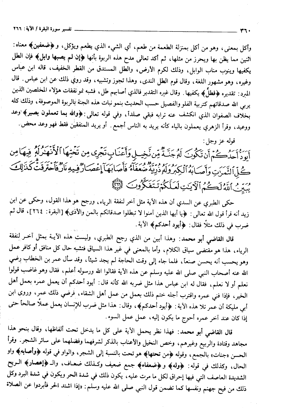 أَيَوَدُّ أَحَدُكُمْ أَنْ تَكُونَ لَهُ جَنَّةٌ مِنْ نَخِيلٍ وَأَعْنابٍ تَجْرِي مِنْ تَحْتِهَا الْأَنْهارُ لَهُ فِيها مِنْ كُلِّ الثَّمَراتِ وَأَصابَهُ الْكِبَرُ وَلَهُ ذُرِّيَّةٌ ضُعَفاءُ فَأَصابَها إِعْصارٌ فِيهِ نارٌ فَاحْتَرَقَتْ كَذلِكَ يُبَيِّنُ اللَّهُ لَكُمُ الْآياتِ لَعَلَّكُمْ تَتَفَكَّرُونَ (٢٦٦)