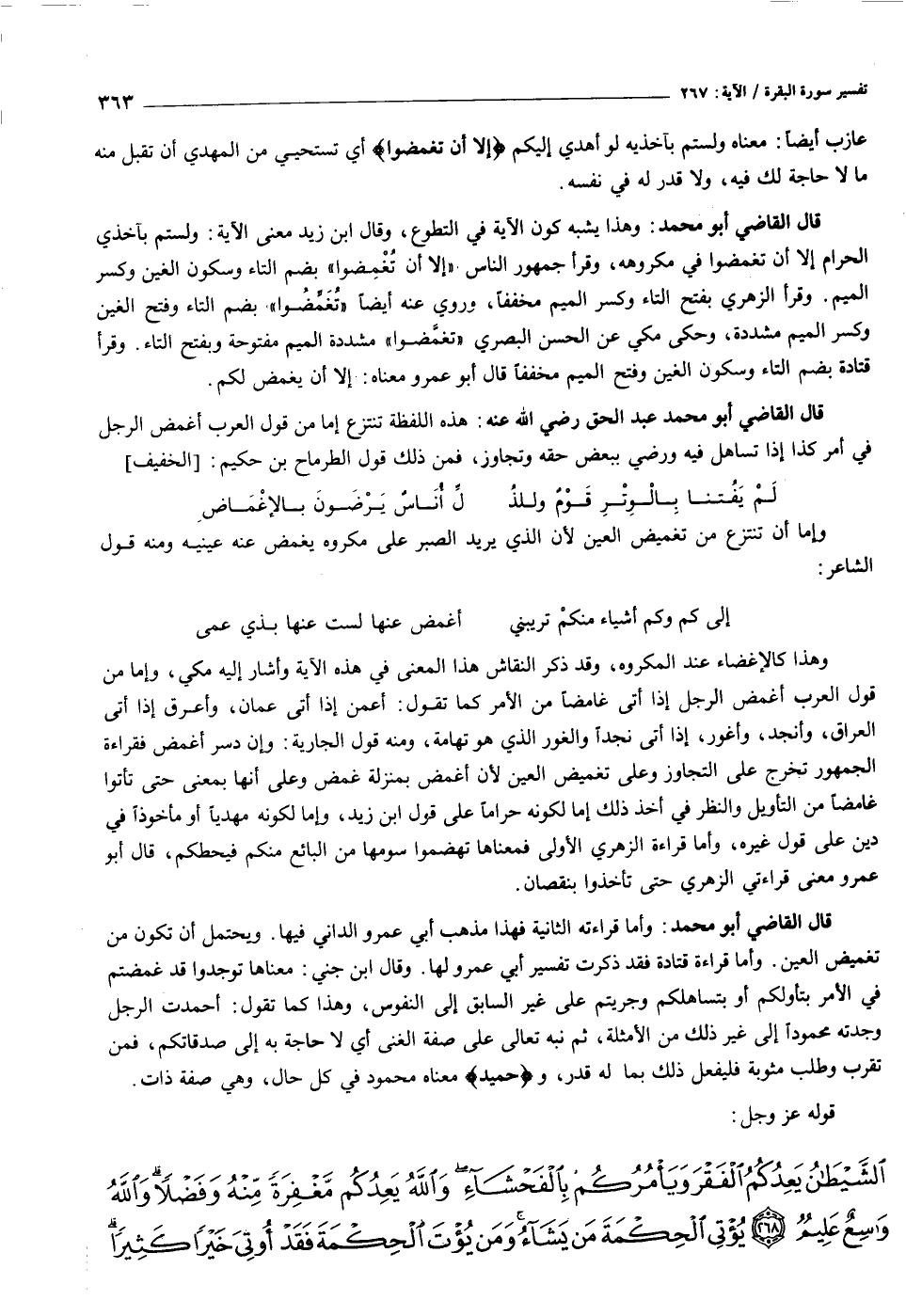 قال القاضي أبو محمد: وهذا يشبه كون الآية في التطوع، وقال ابن زيد معنى الآية: ولستم بآخذي الحرام إلا أن تغمضوا في مكروهه، وقرأ جمهور الناس «إلا أن تغمضوا» بضم التاء وسكون الغين وكسر الميم. وقرأ الزهري بفتح التاء وكسر الميم مخففا، وروي عنه أيضا «تغمّضوا» بضم التاء وفتح الغين وكسر الميم مشددة، وحكى مكي عن الحسن البصري «تغمّضوا» مشددة الميم مفتوحة وبفتح التاء. وقرأ قتادة بضم التاء وسكون الغين وفتح الميم مخففا قال أبو عمرو معناه: إلا أن يغمض لكم.