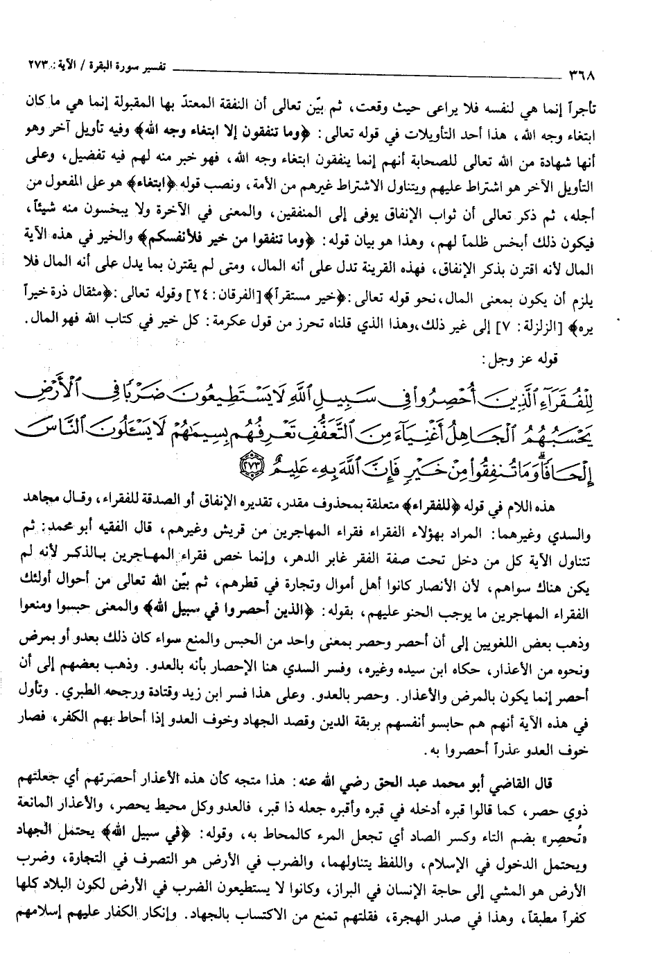 لِلْفُقَراءِ الَّذِينَ أُحْصِرُوا فِي سَبِيلِ اللَّهِ لا يَسْتَطِيعُونَ ضَرْباً فِي الْأَرْضِ يَحْسَبُهُمُ الْجاهِلُ أَغْنِياءَ مِنَ التَّعَفُّفِ تَعْرِفُهُمْ بِسِيماهُمْ لا يَسْئَلُونَ النَّاسَ إِلْحافاً وَما تُنْفِقُوا مِنْ خَيْرٍ فَإِنَّ اللَّهَ بِهِ عَلِيمٌ (٢٧٣)