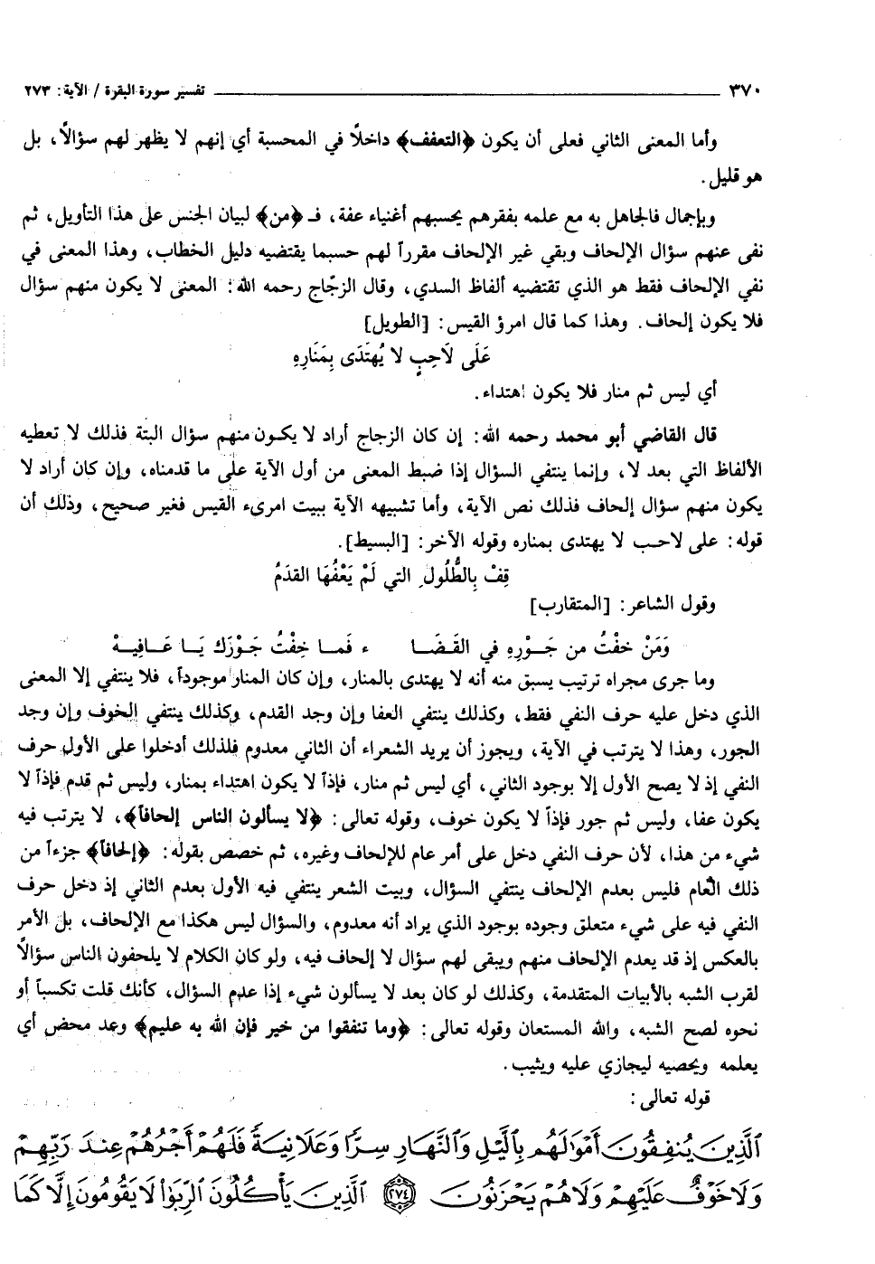 قال القاضي أبو محمد رحمه الله: إن كان الزجاج أراد لا يكون منهم سؤال البتة فذلك لا تعطيه الألفاظ التي بعد لا، وإنما ينتفي السؤال إذا ضبط المعنى من أول الآية على ما قدمناه، وإن كان أراد لا يكون منهم سؤال إلحاف فذلك نص الآية، وأما تشبيهه الآية ببيت امرئ القيس فغير صحيح، وذلك أن قوله: على لاحب لا يهتدى بمناره وقوله الآخر: [البسيط] .
