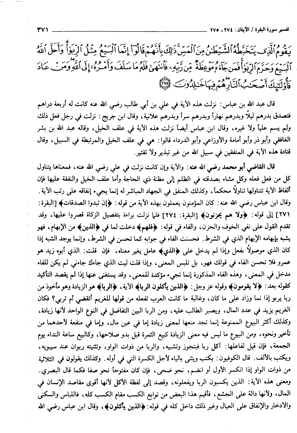 ٢٧١] إلى قوله: وَلا هُمْ يَحْزَنُونَ [البقرة: ٢٧٤] فلما نزلت براءة بتفصيل الزكاة قصروا عليها، وقد تقدم القول على نفي الخوف والحزن، والفاء في قوله: فَلَهُمْ دخلت لما في الَّذِينَ من الإبهام، فهو يشبه بإبهامه الإبهام الذي في الشرط. فحسنت الفاء في جوابه كما تحسن في الشرط، وإنما يوجد الشبه إذا كان الذي موصولا بفعل وإذا لم يدخل على «الذي» عامل يغير معناه، فإن قلت: الذي أبوه زيد هو عمرو فلا تحسن الفاء في قولك فهو، بل تلبس المعنى، وإذا قلت ليت الذي جاءك جاءني لم يكن للفاء مدخل في المعنى، وهذه الفاء المذكورة إنما تجيء مؤكدة للمعنى، وقد يستغنى عنها إذا لم يقصد التأكيد كقوله بعد: لا يَقُومُونَ وقوله عز وجل: الَّذِينَ يَأْكُلُونَ الرِّبا الآية، الرِّبا هو الزيادة وهو مأخوذ من ربا يربو إذا نما وزاد على ما كان، وغالبة ما كانت العرب تفعله من قولها للغريم أتقضي أم تربي؟ فكان الغريم يزيد في عدد المال، ويصبر الطالب عليه، ومن الربا البين التفاضل في النوع الواحد لأنها زيادة، وكذلك أكثر البيوع الممنوعة إنما تجد منعها لمعنى زيادة إما في عين مال، وإما في منفعة لأحدهما من تأخير ونحوه، ومن البيوع ما ليس فيه معنى الزيادة كبيع الثمرة قبل بدو صلاحها، وكالبيع ساعة النداء يوم الجمعة، فإن قيل لفاعلها: آكل ربا فبتجوز وتشبيه، والربا من ذوات الواو، وتثنيته ربوان عند سيبويه، ويكتب بالألف. قال الكوفيون: يكتب ويثنى بالياء لأجل الكسرة التي في أوله. وكذلك يقولون في الثلاثية من ذوات الواو إذا انكسر الأول أو انضم، نحو ضحى، فإن كان مفتوحا نحو صفا فكما قال البصري.
