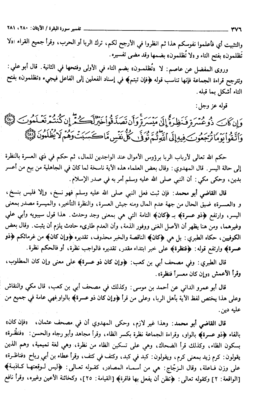وَإِنْ كانَ ذُو عُسْرَةٍ فَنَظِرَةٌ إِلى مَيْسَرَةٍ وَأَنْ تَصَدَّقُوا خَيْرٌ لَكُمْ إِنْ كُنْتُمْ تَعْلَمُونَ (٢٨٠) وَاتَّقُوا يَوْماً تُرْجَعُونَ فِيهِ إِلَى اللَّهِ ثُمَّ تُوَفَّى كُلُّ نَفْسٍ ما كَسَبَتْ وَهُمْ لا يُظْلَمُونَ (٢٨١)