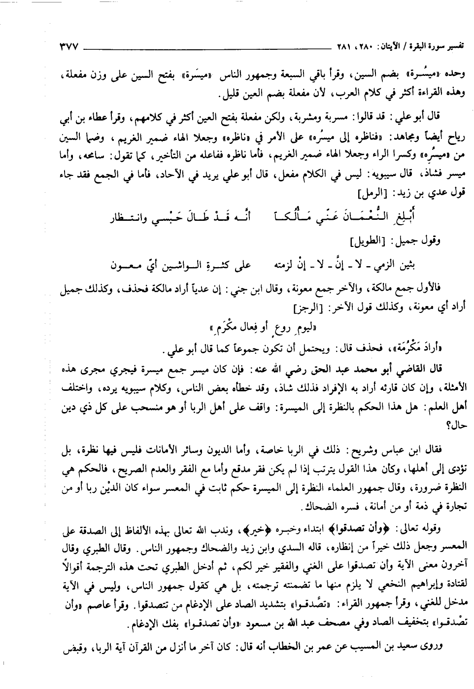 قال القاضي أبو محمد عبد الحق رضي الله عنه: فإن كان ميسر جمع ميسرة فيجري مجرى هذه الأمثلة، وإن كان قارئه أراد به الإفراد فذلك شاذ، وقد خطأه بعض الناس، وكلام سيبويه يرده، واختلف أهل العلم: هل هذا الحكم بالنظرة إلى الميسرة: واقف على أهل الربا أو هو منسحب على كل ذي دين حال؟