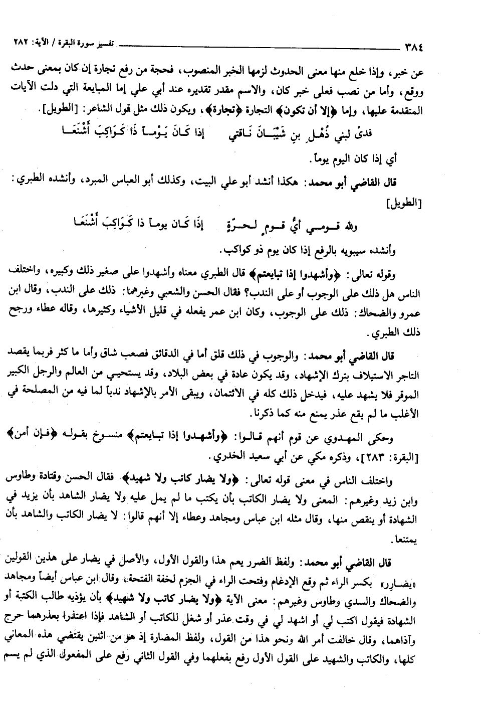 واختلف الناس في معنى قوله تعالى: وَلا يُضَارَّ كاتِبٌ وَلا شَهِيدٌ. فقال الحسن وقتادة وطاوس وابن زيد وغيرهم: المعنى ولا يضار الكاتب بأن يكتب ما لم يمل عليه ولا يضار الشاهد بأن يزيد في الشهادة أو ينقص منها، وقال مثله ابن عباس ومجاهد وعطاء إلا أنهم قالوا: لا يضار الكاتب والشاهد بأن يمتنعا.