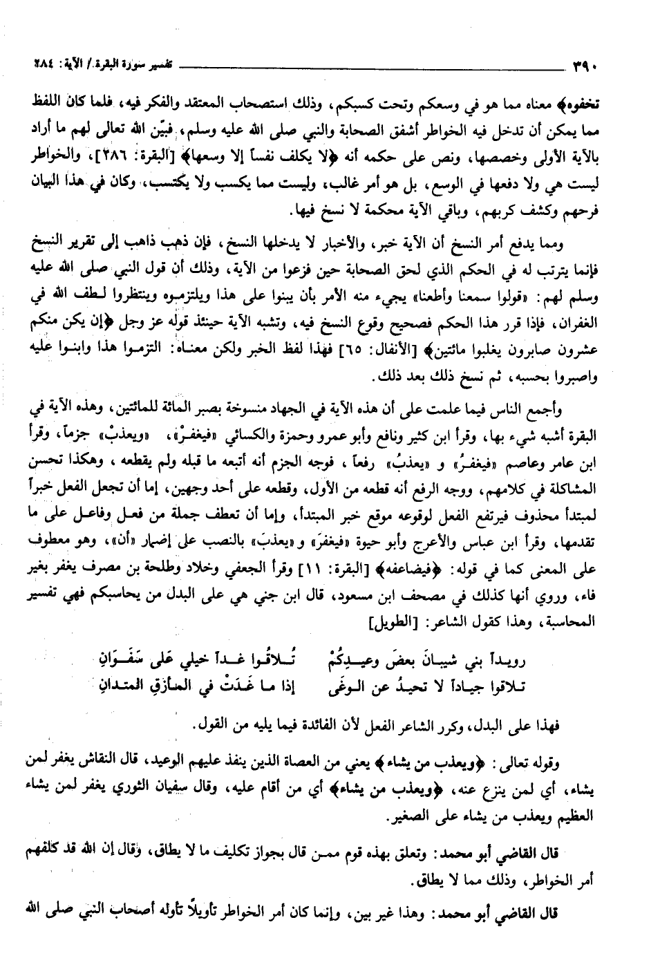 وأجمع الناس فيما علمت على أن هذه الآية في الجهاد منسوخة بصبر المائة للمائتين، وهذه الآية في البقرة أشبه شيء بها، وقرأ ابن كثير ونافع وأبو عمرو وحمزة والكسائي «فيغفر» ، «ويعذب» جزما، وقرأ ابن عامر وعاصم «فيغفر» و «يعذب» رفعا، فوجه الجزم أنه أتبعه ما قبله ولم يقطعه، وهكذا تحسن المشاكلة في كلامهم، ووجه الرفع أنه قطعه من الأول، وقطعه على أحد وجهين، إما أن تجعل الفعل خبرا لمبتدأ محذوف فيرتفع الفعل لوقوعه موقع خبر المبتدأ، وإما أن تعطف جملة من فعل وفاعل على ما تقدمها، وقرأ ابن عباس والأعرج وأبو حيوة «فيغفر» و «يعذب» بالنصب على إضمار «أن» ، وهو معطوف على المعنى كما في قوله: فَيُضاعِفَهُ [الحديد ١١] وقرأ الجعفي وخلاد وطلحة بن مصرف يغفر بغير فاء، وروي أنها كذلك في مصحف ابن مسعود، قال ابن جني هي على البدل من يحاسبكم فهي تفسير المحاسبة، وهذا كقول الشاعر: [الطويل]