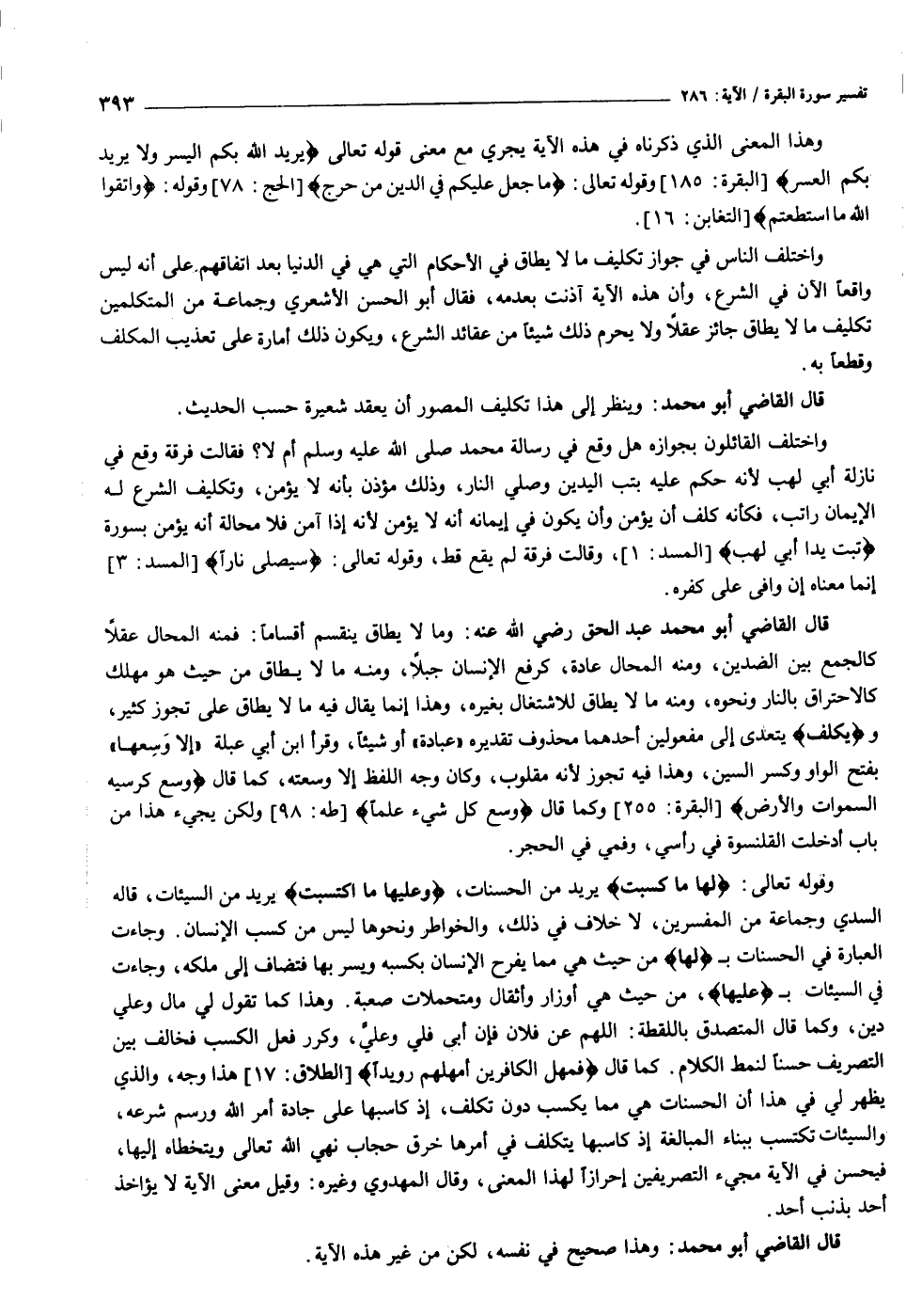 واختلف الناس في جواز تكليف ما لا يطاق في الأحكام التي هي في الدنيا بعد اتفاقهم على أنه ليس واقعا الآن في الشرع، وأن هذه الآية آذنت بعدمه، فقال أبو الحسن الأشعري وجماعة من المتكلمين تكليف ما لا يطاق جائز عقلا ولا يحرم ذلك شيئا من عقائد الشرع، ويكون ذلك أمارة على تعذيب المكلف وقطعا به.