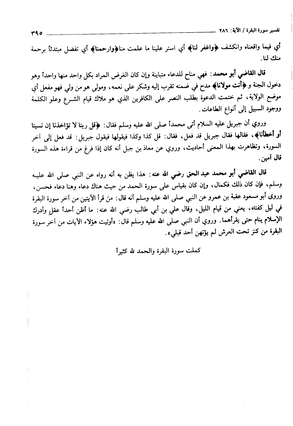قال القاضي أبو محمد عبد الحق رضي الله عنه: هذا يظن به أنه رواه عن النبي صلى الله عليه وسلم، فإن كان ذلك فكمال، وإن كان بقياس على سورة الحمد من حيث هناك دعاء وهنا دعاء فحسن، وروى أبو مسعود عقبة بن عمرو عن النبي صلى الله عليه وسلم أنه قال: من قرأ الآيتين من آخر سورة البقرة في ليل كفتاه، يعني من قيام الليل، وقال علي بن أبي طالب رضي الله عنه: ما أظن أحدا عقل وأدرك الإسلام ينام حتى يقرأهما. وروي أن النبي صلى الله عليه وسلم قال: «أوتيت هؤلاء الآيات من آخر سورة البقرة من كنز تحت العرش لم يؤتهن أحد قبلي» .