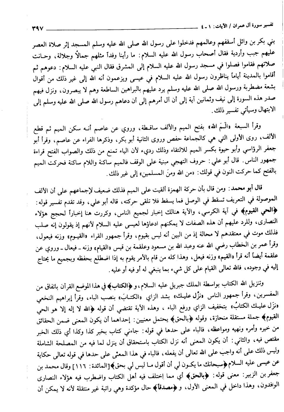 وتنزيل الله الكتاب بواسطة الملك جبريل عليه السلام، والْكِتابَ في هذا الموضع القرآن باتفاق من المفسرين، وقرأ جمهور الناس «نزّل عليك» بشد الزاي «الكتاب» بنصب الباء، وقرأ إبراهيم النخعي «نزل عليك الكتاب» بتخفيف الزاي ورفع الباء، وهذه الآية تقتضي أن قوله اللَّهُ لا إِلهَ إِلَّا هُوَ الْحَيُّ الْقَيُّومُ جملة مستقلة منحازة، وقوله بِالْحَقِّ يحتمل معنيين: إحداهما أن يكون المعنى ضمن الحقائق من خيره وأمره ونهيه ومواعظه، فالباء على حدها في قوله: جاءني كتاب بخبر كذا وكذا أي ذلك الخبر مقتص فيه، والثاني: أن يكون المعنى أنه نزل الكتاب باستحقاق أن ينزل لما فيه من المصلحة الشاملة وليس ذلك على أنه واجب على الله تعالى أن يفعله، فالباء في هذا المعنى على حدها في قوله تعالى حكاية عن عيسى عليه السلام سُبْحانَكَ ما يَكُونُ لِي أَنْ أَقُولَ ما لَيْسَ لِي بِحَقٍّ [المائدة: ١١٦] وقال محمد بن جعفر بن الزبير: معنى قوله بِالْحَقِّ أي مما اختلف فيه أهل الكتاب واضطرب فيه هؤلاء النصارى الوافدون، وهذا داخل في المعنى الأول، ومُصَدِّقاً حال مؤكدة وهي راتبة غير منتقلة لأنه لا يمكن أن