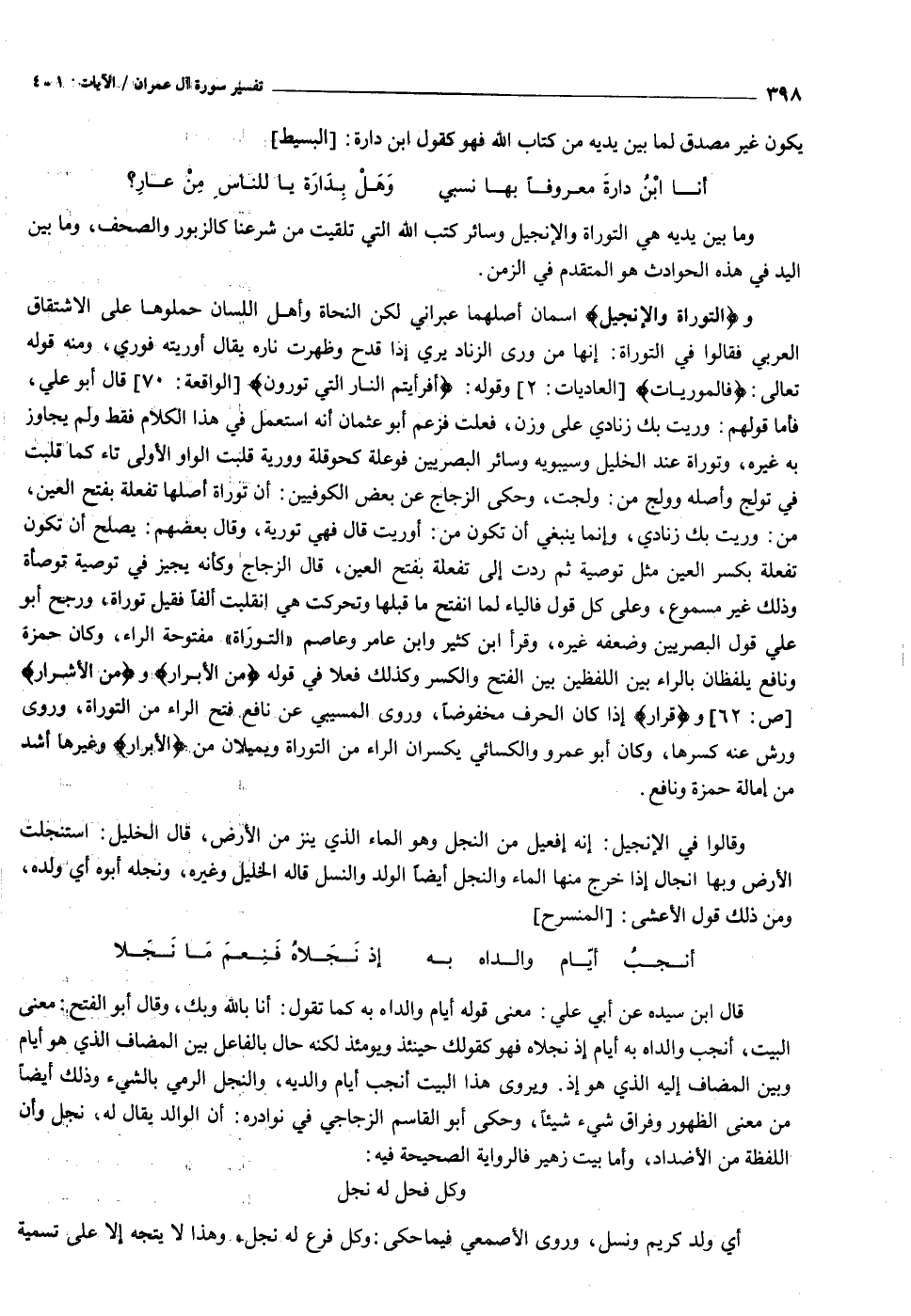 والتَّوْراةَ وَالْإِنْجِيلَ اسمان أصلهما عبراني لكن النحاة وأهل اللسان حملوها على الاشتقاق العربي فقالوا في التوراة: إنها من ورى الزناد يري إذا قدح وظهرت ناره يقال أوريته فوري، ومنه قوله تعالى: فَالْمُورِياتِ [العاديات: ٢] وقوله: أَفَرَأَيْتُمُ النَّارَ الَّتِي تُورُونَ [الواقعة: ٧٠] قال أبو علي، فأما قولهم: وريت بك زنادي على وزن، فعلت فزعم أبو عثمان أنه استعمل في هذا الكلام فقط ولم يجاوز به غيره، وتوراة عند الخليل وسيبويه وسائر البصريين فوعلة كحوقلة وورية قلبت الواو الأولى تاء كما قلبت في تولج وأصله وولج من: ولجت، وحكى الزجاج عن بعض الكوفيين: أن توراة أصلها تفعلة بفتح العين، من: وريت بك زنادي، وإنما ينبغي أن تكون من: أوريت قال فهي تورية، وقال بعضهم: يصلح أن تكون تفعلة بكسر العين مثل توصية ثم ردت إلى تفعلة بفتح العين، قال الزجاج وكأنه يجيز في توصية توصأة وذلك غير مسموع، وعلى كل قول فالياء لما انفتح ما قبلها وتحركت هي انقلبت ألفا فقيل توراة، ورجح أبو علي قول البصريين وضعفه غيره، وقرأ ابن كثير وابن عامر وعاصم «التوراة» مفتوحة الراء، وكان حمزة ونافع يلفظان بالراء بين اللفظين بين الفتح والكسر وكذلك فعلا في قوله من الأبرار ومِنَ الْأَشْرارِ [ص: ٦٢] وقَرارٍ إذا كان الحرف مخفوضا، وروى المسيبي عن نافع فتح الراء من التوراة، وروى ورش عنه كسرها، وكان أبو عمرو والكسائي يكسران الراء من التوراة ويميلان من الْأَبْرارِ وغيرها أشد من إمالة حمزة ونافع.