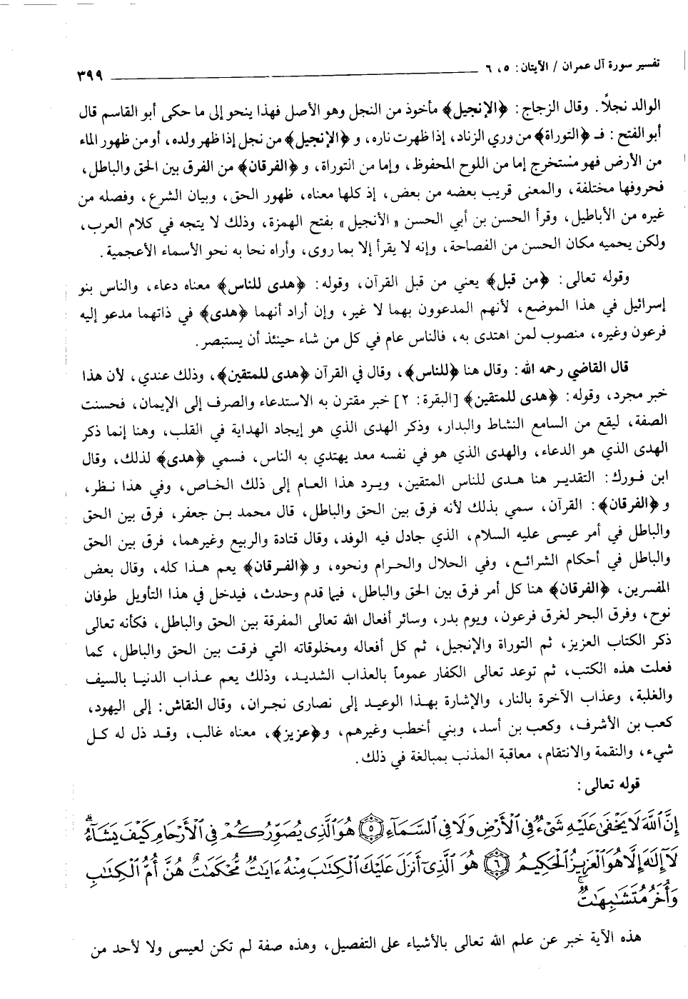 قال القاضي رحمه الله: وقال هنا لِلنَّاسِ، وقال في القرآن هُدىً لِلْمُتَّقِينَ، وذلك عندي، لأن هذا خبر مجرد، وقوله: هُدىً لِلْمُتَّقِينَ [البقرة: ٢] خبر مقترن به الاستدعاء والصرف إلى الإيمان، فحسنت الصفة، ليقع من السامع النشاط والبدار، وذكر الهدى الذي هو إيجاد الهداية في القلب، وهنا إنما ذكر الهدى الذي هو الدعاء، والهدى الذي هو في نفسه معد يهتدي به الناس، فسمي هُدىً لذلك، وقال ابن فورك: التقدير هنا هدى للناس المتقين، ويرد هذا العام إلى ذلك الخاص، وفي هذا نظر، والْفُرْقانَ: القرآن، سمي بذلك لأنه فرق بين الحق والباطل، قال محمد بن جعفر، فرق بين الحق والباطل في أمر عيسى عليه السلام، الذي جادل فيه الوفد، وقال قتادة والربيع وغيرهما، فرق بين الحق والباطل في أحكام الشرائع، وفي الحلال والحرام ونحوه، والْفُرْقانَ يعم هذا كله، وقال بعض المفسرين، الْفُرْقانَ هنا كل أمر فرق بين الحق والباطل، فيما قدم وحدث، فيدخل في هذا التأويل طوفان نوح، وفرق البحر لغرق فرعون، ويوم بدر، وسائر أفعال الله تعالى المفرقة بين الحق والباطل، فكأنه تعالى ذكر الكتاب العزيز، ثم التوراة والإنجيل، ثم كل أفعاله ومخلوقاته التي فرقت بين الحق والباطل، كما فعلت هذه الكتب، ثم توعد تعالى الكفار عموما بالعذاب الشديد، وذلك يعم عذاب الدنيا بالسيف والغلبة، وعذاب الآخرة بالنار، والإشارة بهذا الوعيد إلى نصارى نجران، وقال النقاش: إلى اليهود، كعب بن الأشرف، وكعب بن أسد، وبني أخطب وغيرهم، وعَزِيزٌ، معناه غالب، وقد ذل له كل شيء، والنقمة والانتقام، معاقبة المذنب بمبالغة في ذلك.
