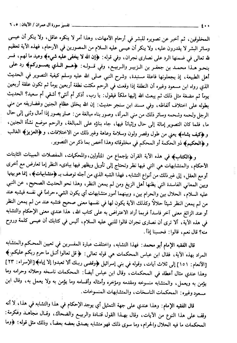 قال الفقيه الإمام أبو محمد: فهذا التشابه، واختلفت عبارة المفسرين في تعيين المحكم والمتشابه المراد بهذه الآية، فقال ابن عباس المحكمات هي قوله تعالى: قُلْ تَعالَوْا أَتْلُ ما حَرَّمَ رَبُّكُمْ عَلَيْكُمْ [الأنعام: ١٥١] إلى ثلاث آيات، وقوله في بني إسرائيل وَقَضى رَبُّكَ أَلَّا تَعْبُدُوا إِلَّا إِيَّاهُ [الإسراء: ٢٣] وهذا عندي مثال أعطاه في المحكمات، وقال ابن عباس أيضا: المحكمات ناسخه وحلاله وحرامه وما يؤمن به ويعمل، والمتشابه منسوخه ومقدمه ومؤخره وأمثاله وأقسامه وما يؤمن به ولا يعمل به، وقال ابن مسعود وغيره: المحكمات الناسخات، والمتشابهات المنسوخات.