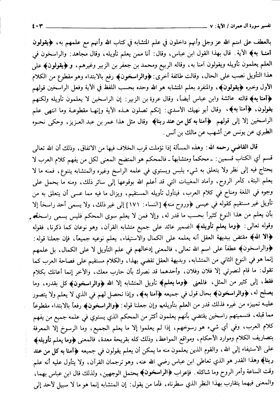 قال القاضي رحمه الله: وهذه المسألة إذا تؤملت قرب الخلاف فيها من الاتفاق، وذلك أن الله تعالى قسم آي الكتاب قسمين: - محكما ومتشابها- فالمحكم هو المتضح المعنى لكل من يفهم كلام العرب لا يحتاج فيه إلى نظر ولا يتعلق به شيء يلبس ويستوي في علمه الراسخ وغيره والمتشابه يتنوع، فمنه ما لا يعلم البتة، كأمر الروح، وآماد المغيبات التي قد أعلم الله بوقوعها إلى سائر ذلك، ومنه ما يحمل على وجوه في اللغة ومناح في كلام العرب، فيتأول تأويله المستقيم، ويزال ما فيه مما عسى أن يتعلق به من تأويل غير مستقيم كقوله في عيسى وَرُوحٌ مِنْهُ [النساء: ١٧١] إلى غير ذلك، ولا يسمى أحد راسخا إلا بأن يعلم من هذا النوع كثيرا بحسب ما قدر له، وإلا فمن لا يعلم سوى المحكم فليس يسمى راسخا، وقوله تعالى: وَما يَعْلَمُ تَأْوِيلَهُ الضمير عائد على جميع متشابه القرآن، وهو نوعان كما ذكرنا، فقوله إِلَّا اللَّهُ مقتض ببديهة العقل أنه يعلمه على الكمال والاستيفاء، يعلم نوعيه جميعا، فإن جعلنا قوله: